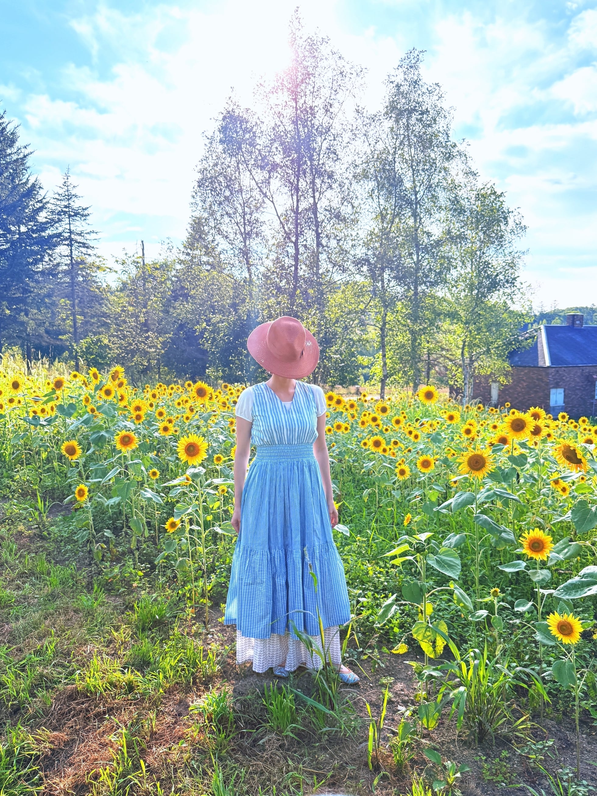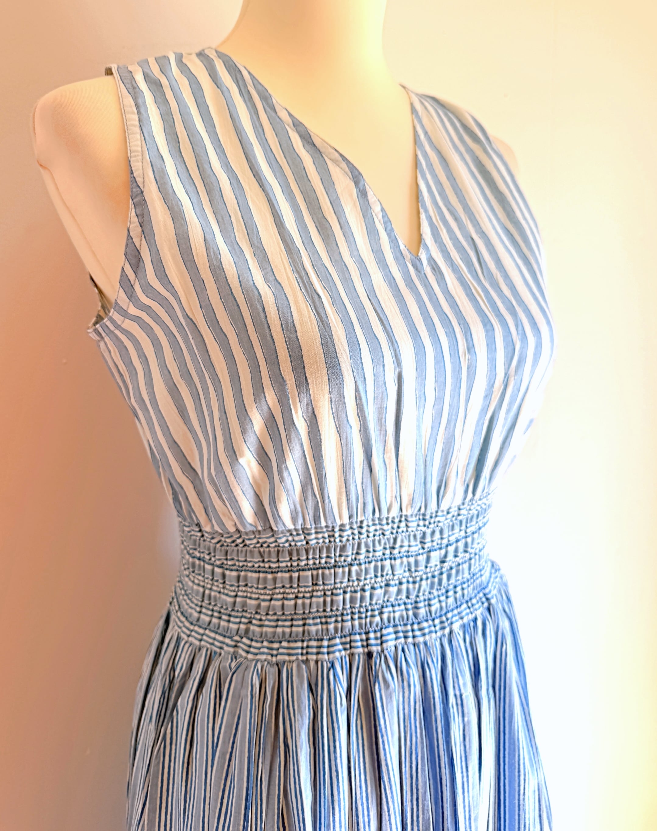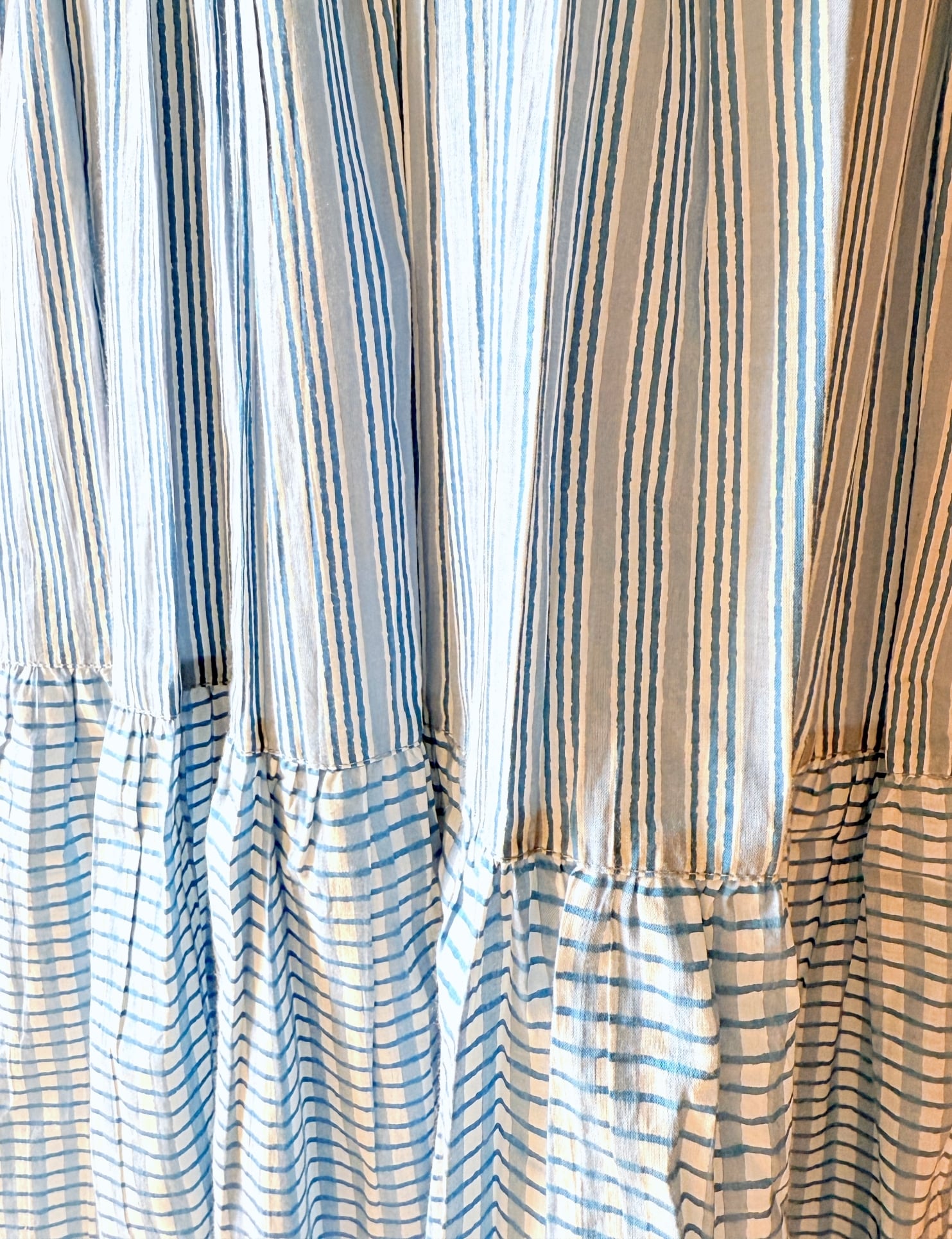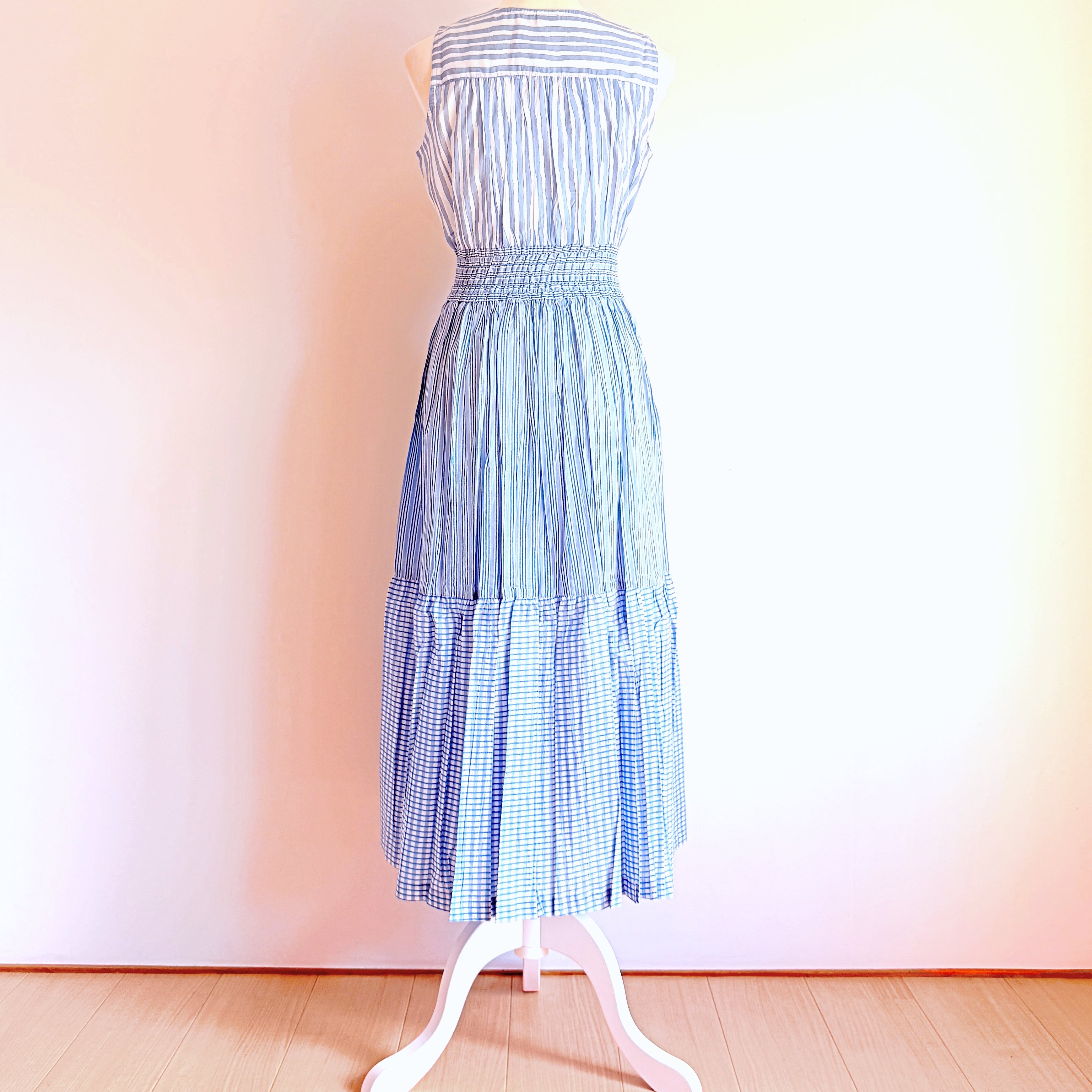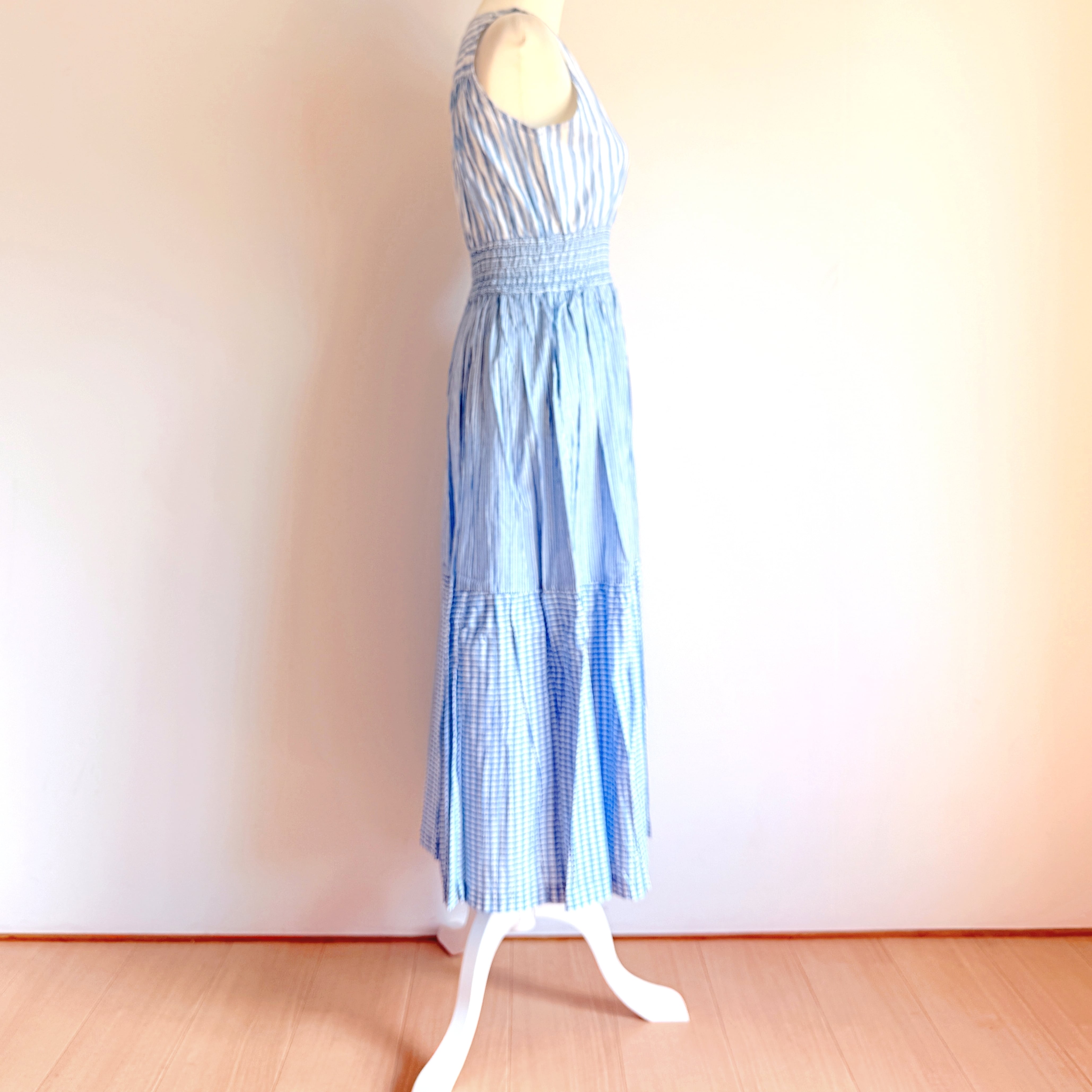 ハンドブロックプリントの揺らぎが美しいスカイブルーのストライプとチェック柄が爽やかな1着。