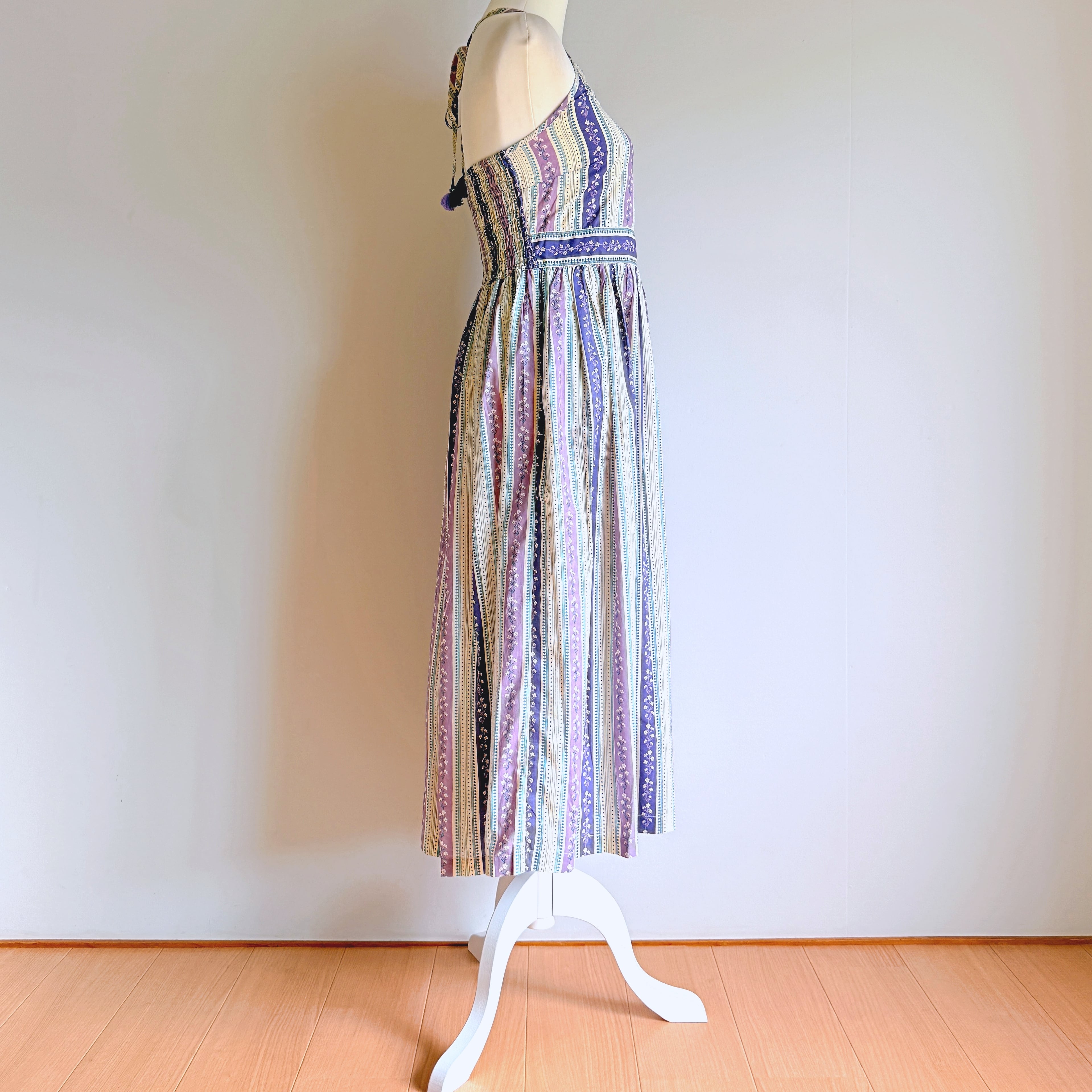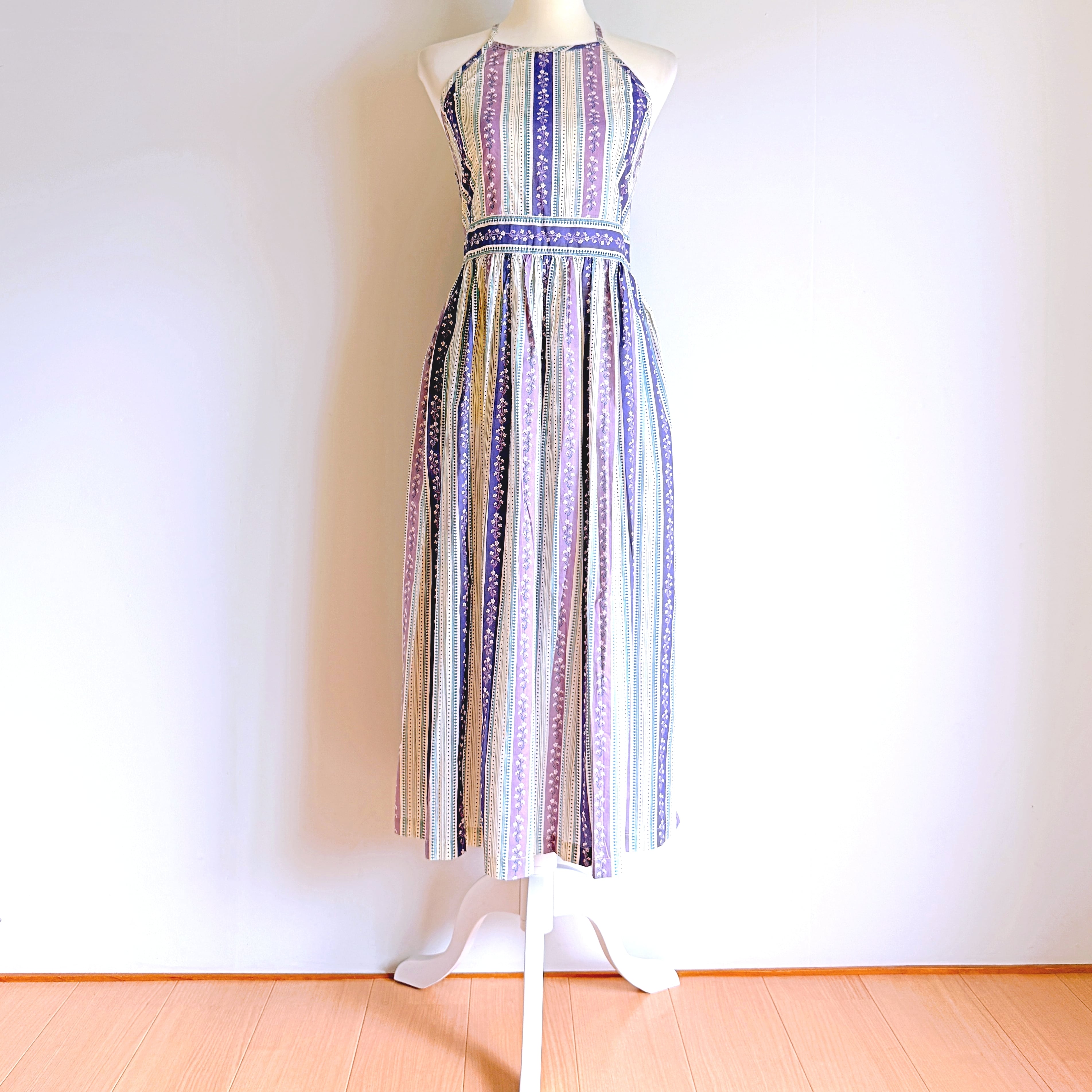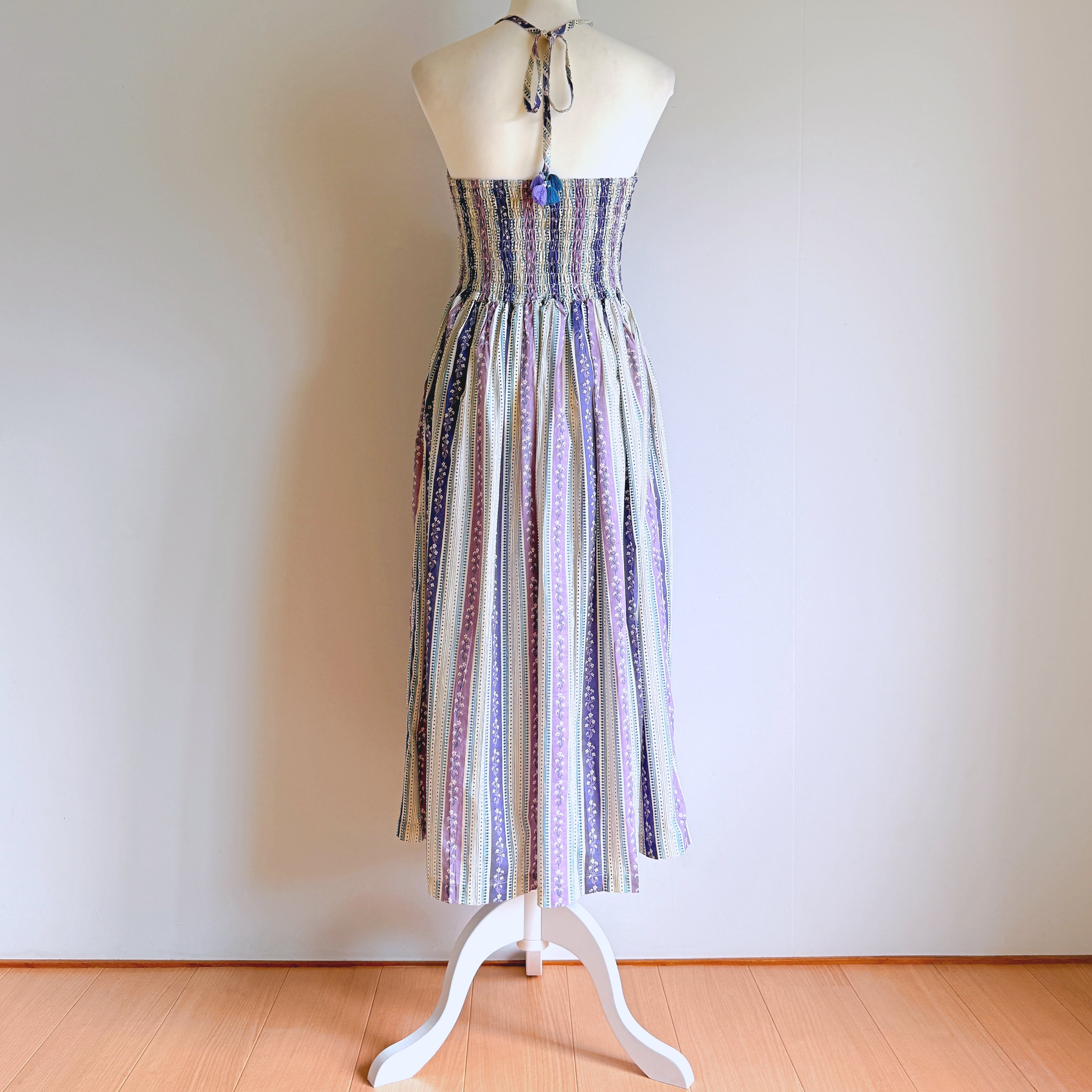 Cottons Jaipur オリジナルのラベンダーカラーのプリントとシルエットが美しいホルターネックワンピース。