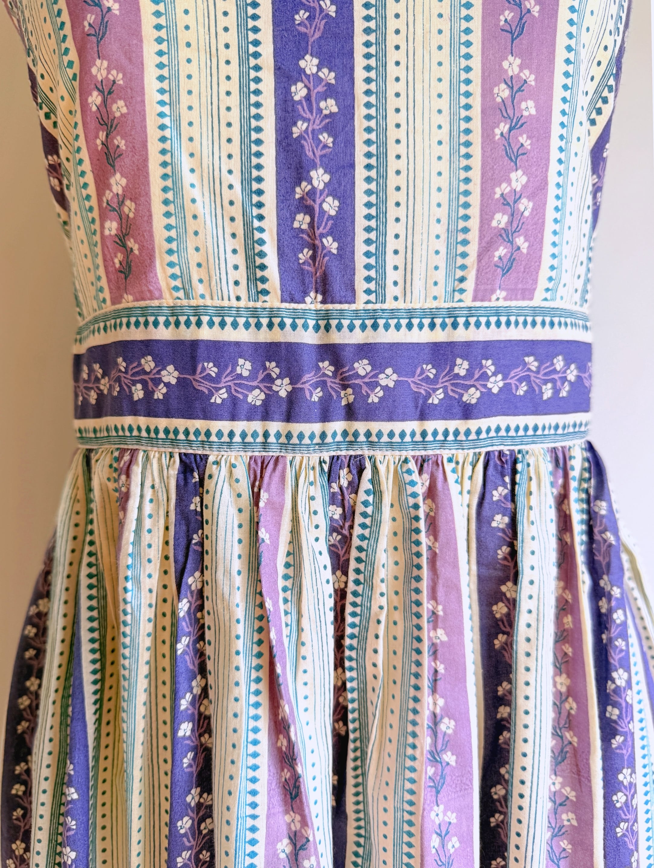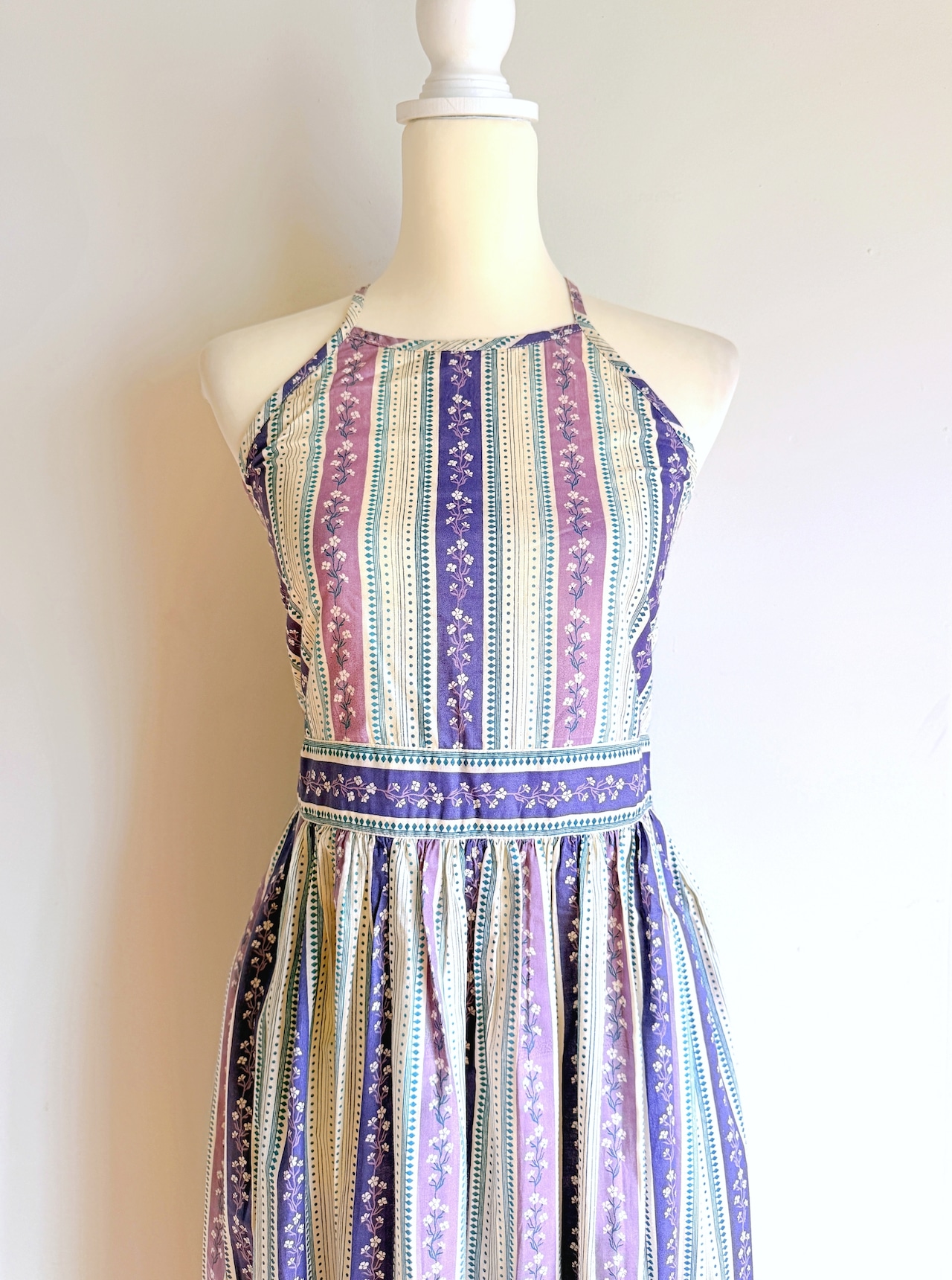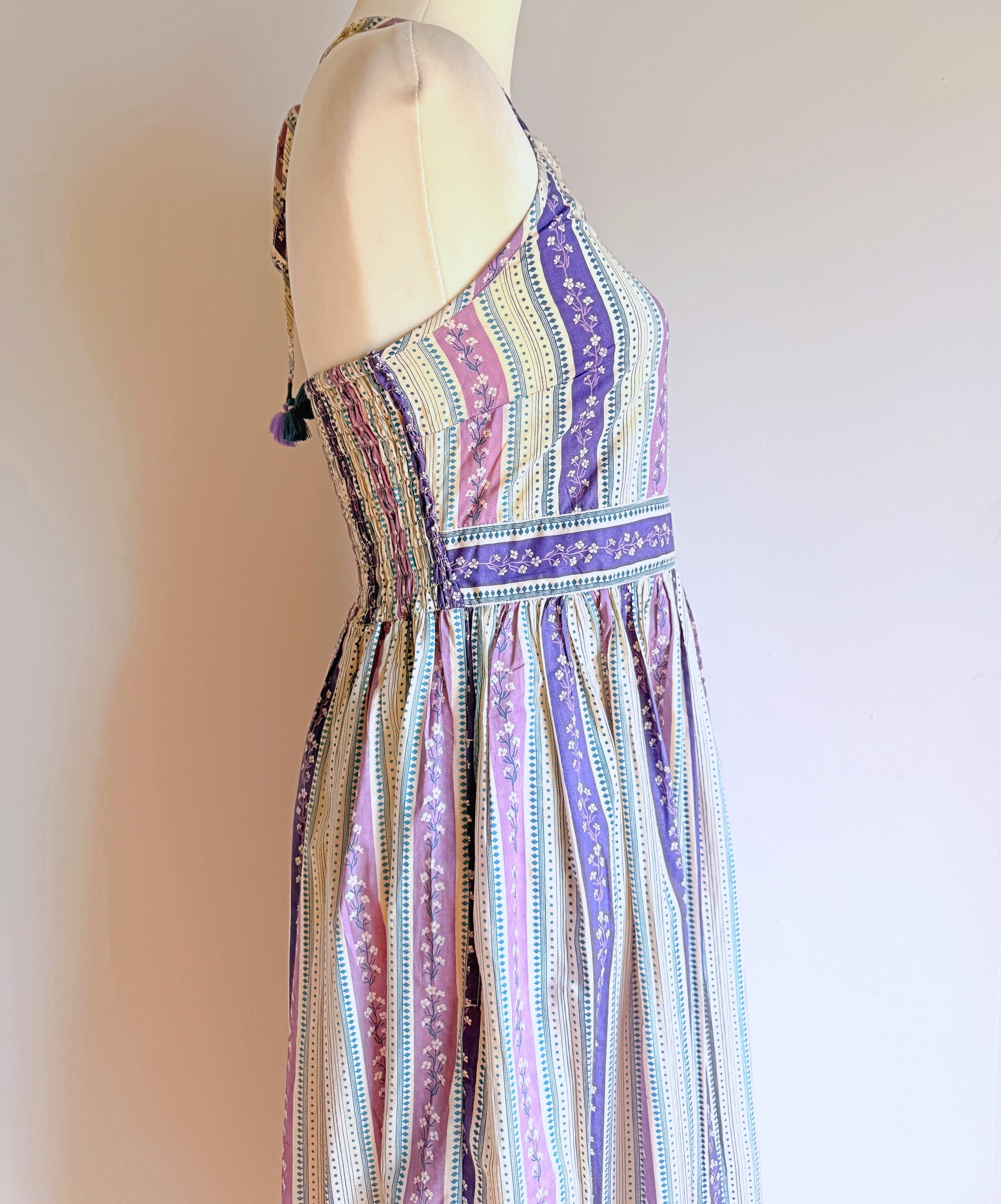 Cottons Jaipur オリジナルのラベンダーカラーのプリントとシルエットが美しいホルターネックワンピース。