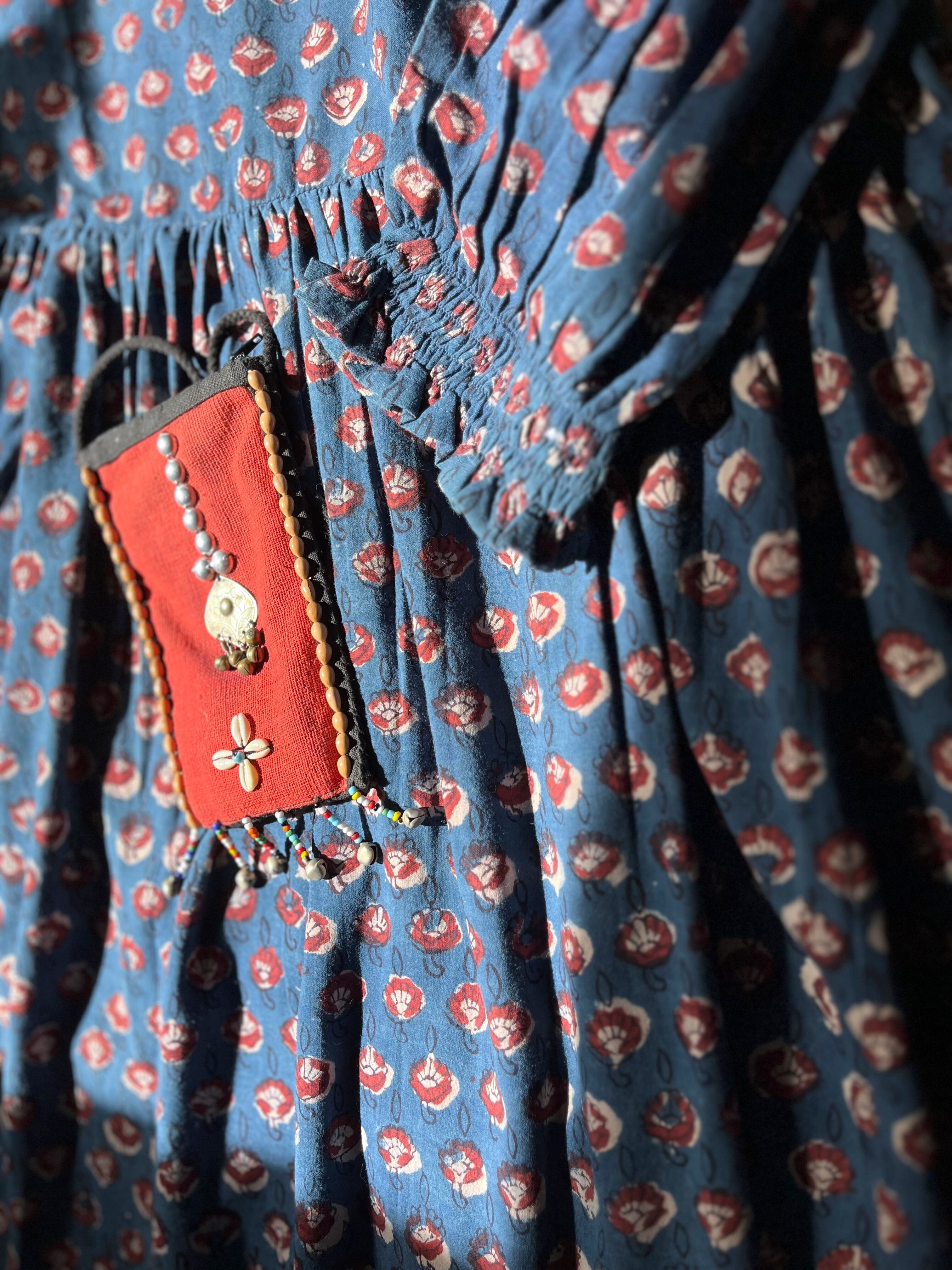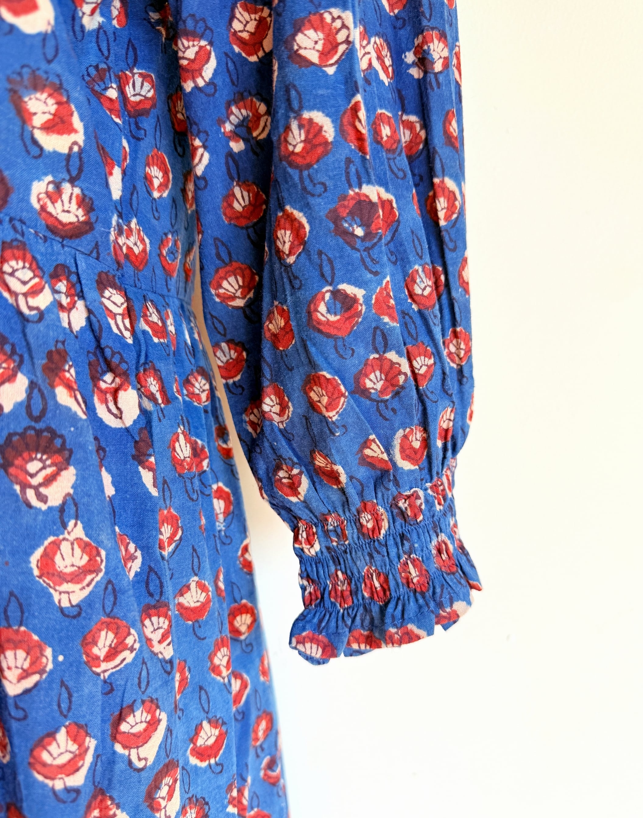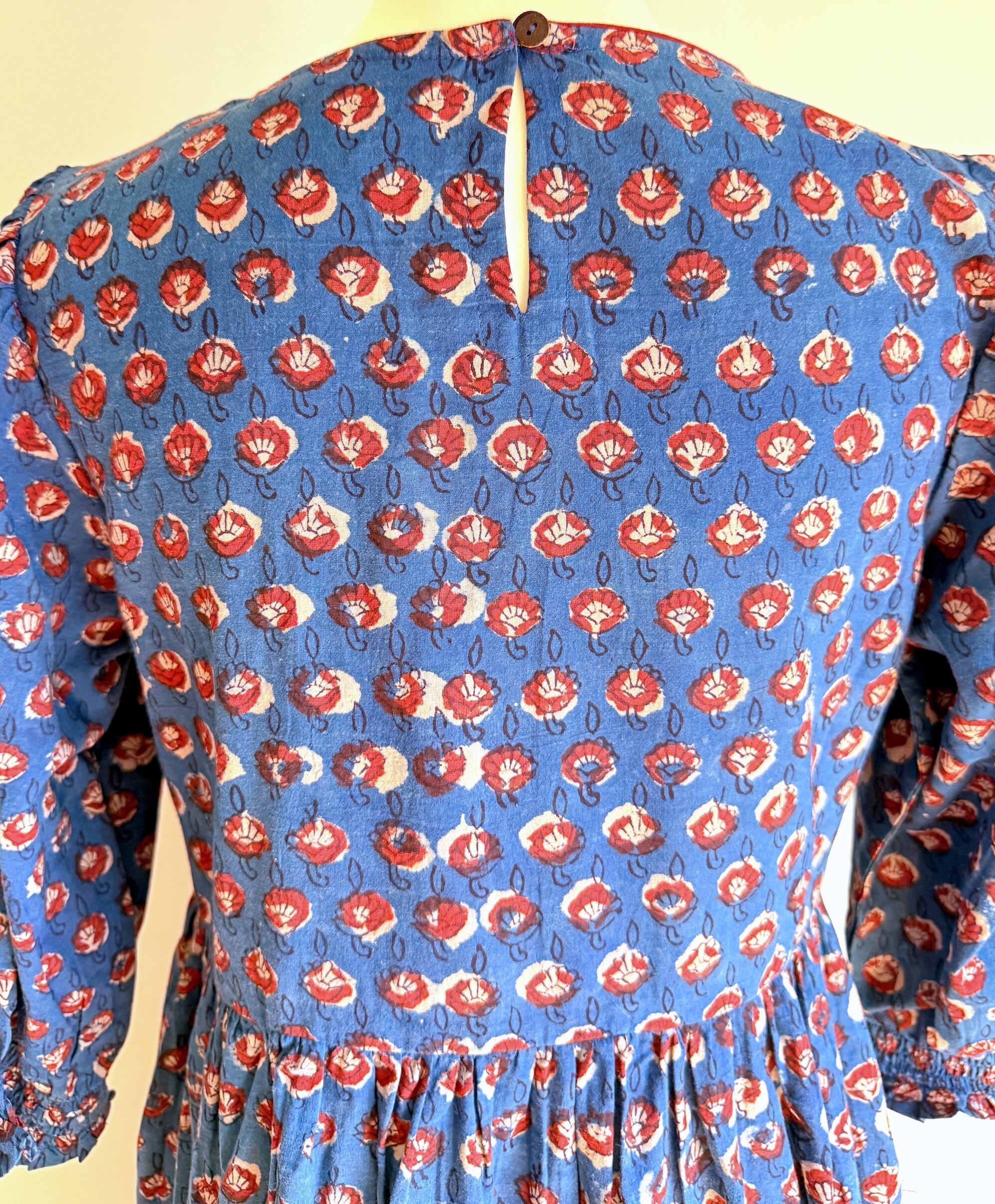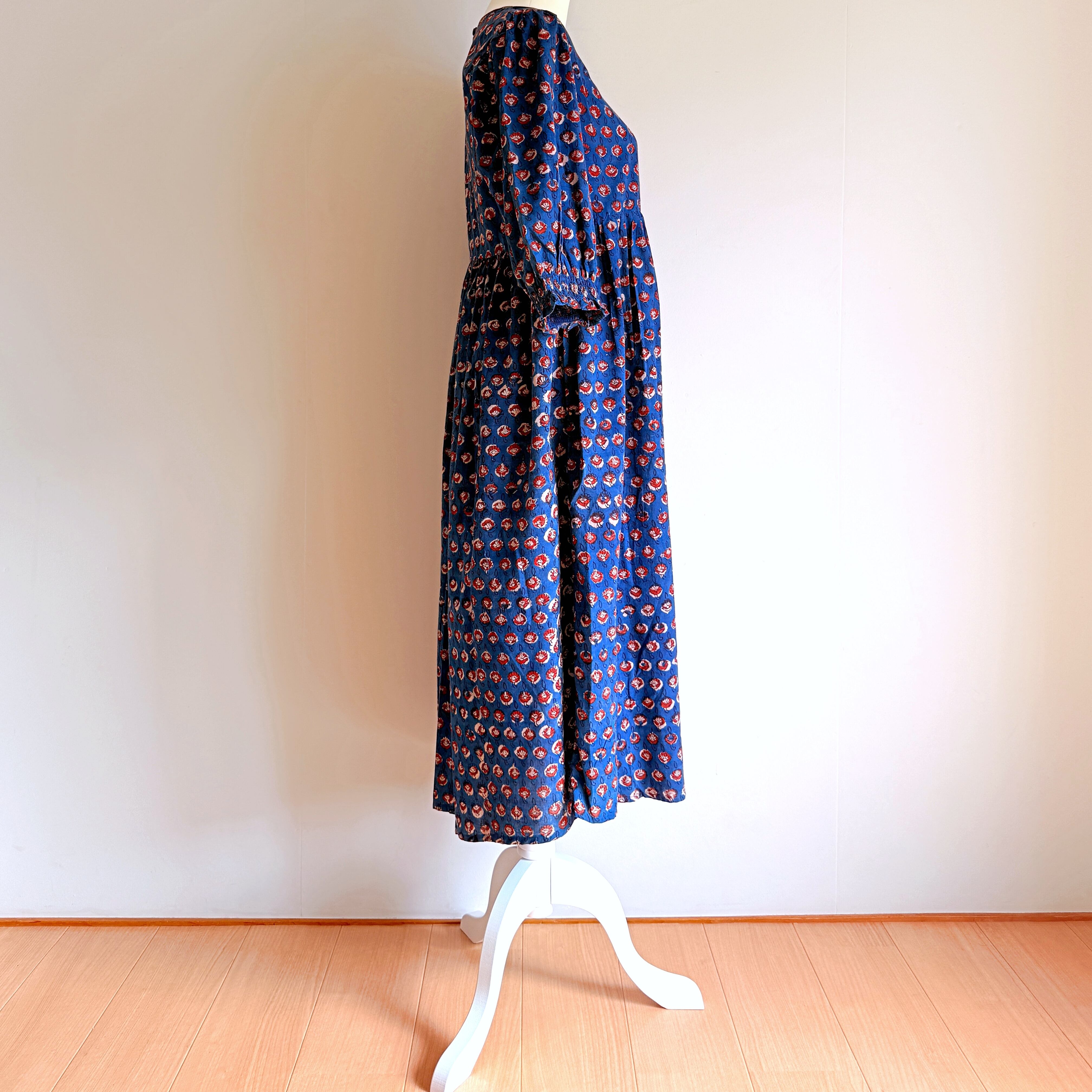 【Taavi】天然藍 カディ Bagru ハンドブロックプリント パフスリーブ ワンピース S〜L