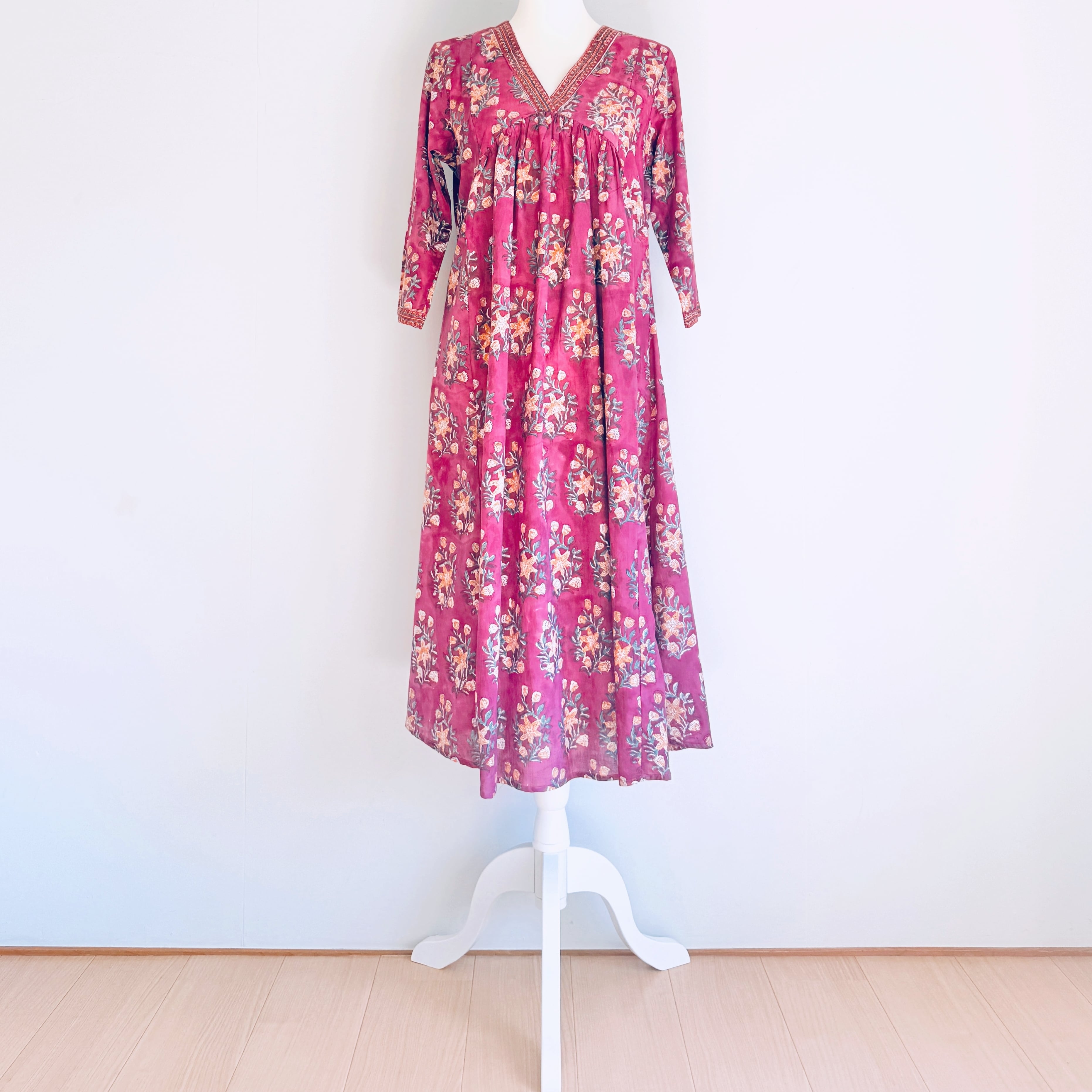 【Aina】ハンドブロックプリント Vネック エンパイア ワンピース CATHERINE S〜L