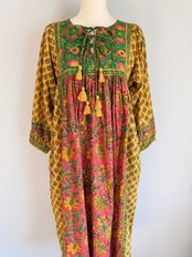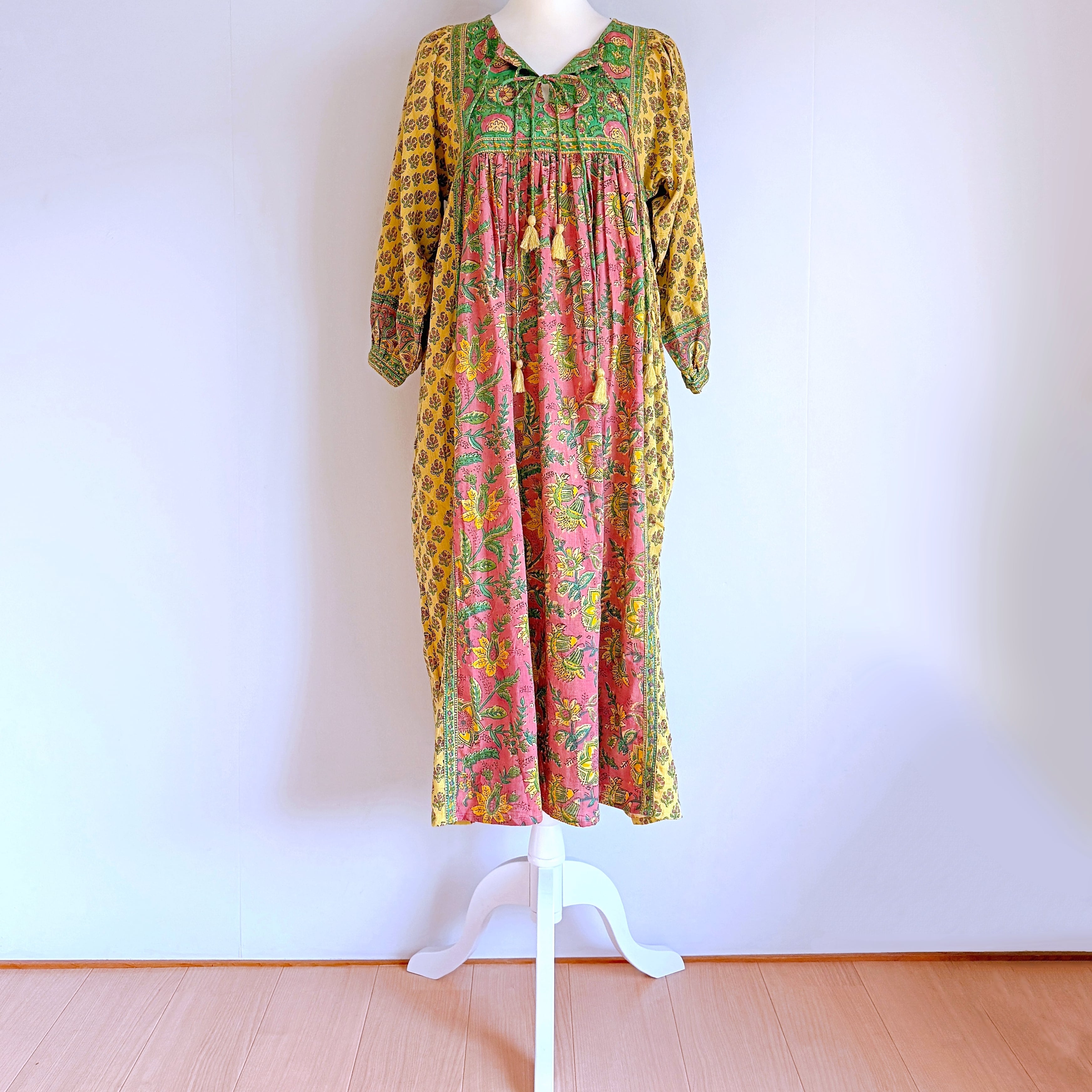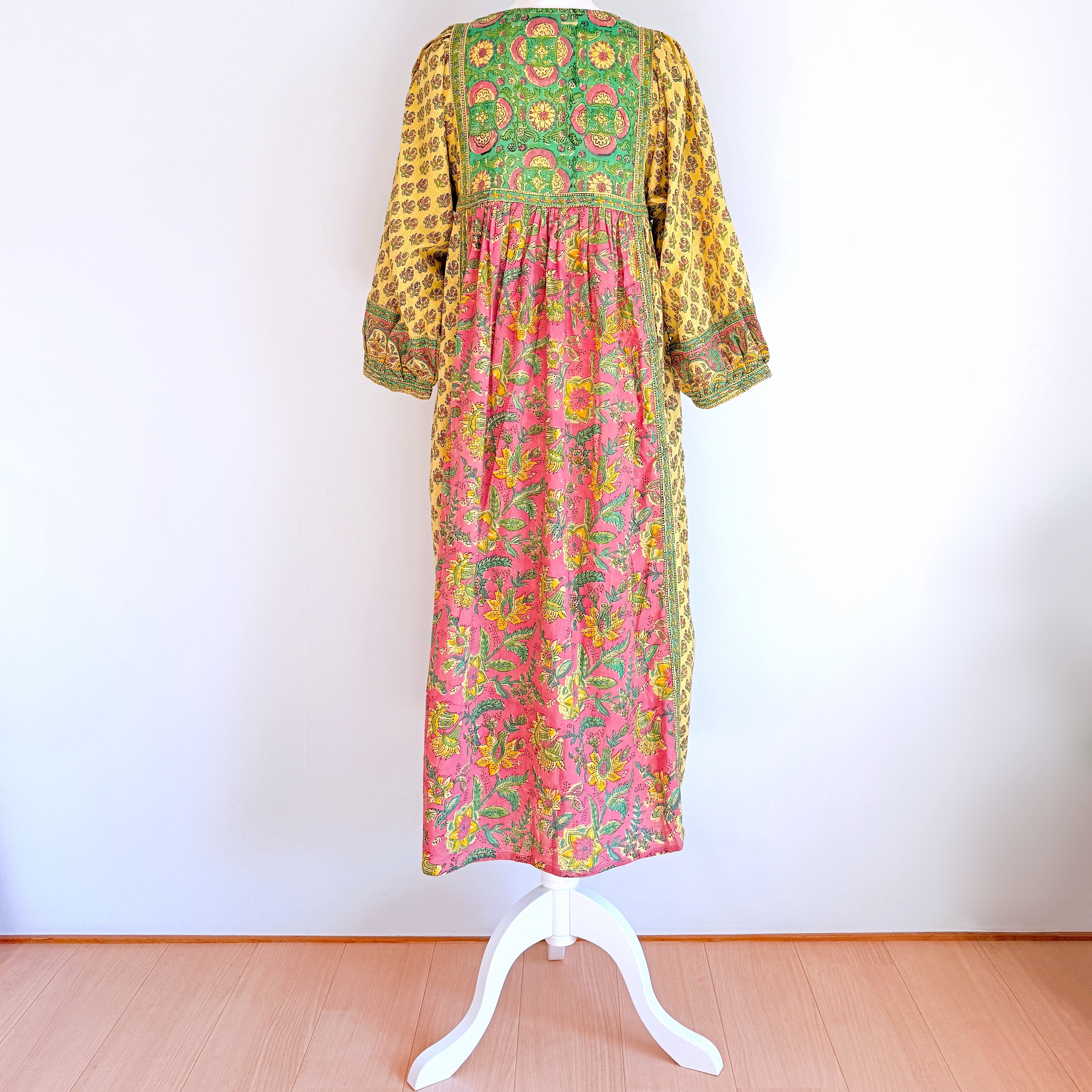他にないカラフルな色合わせも楽しいハンドブロックのマキシワンピースです。