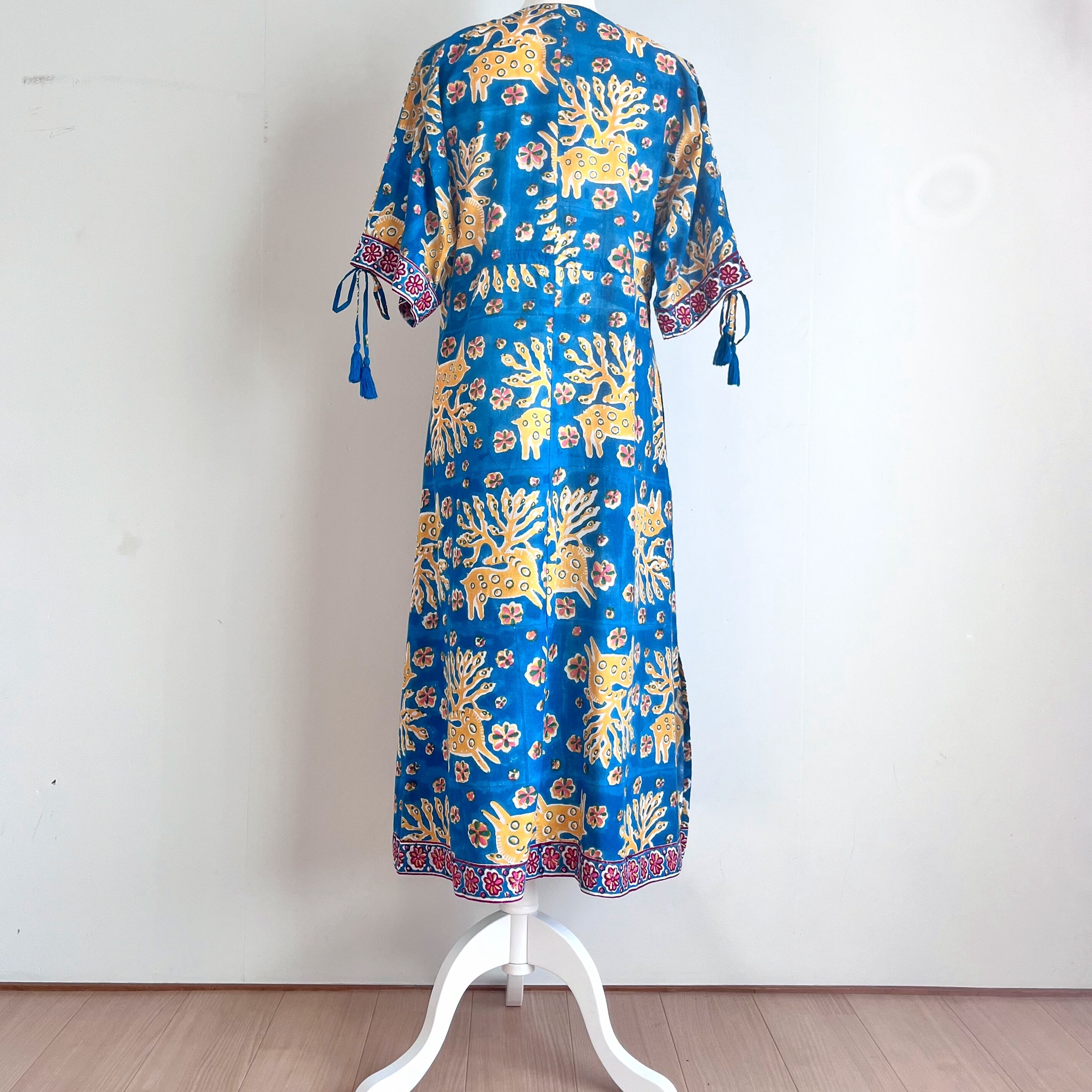 鮮やかなブルーにファンタジックな森の主がモチーフのカフタンワンピース。