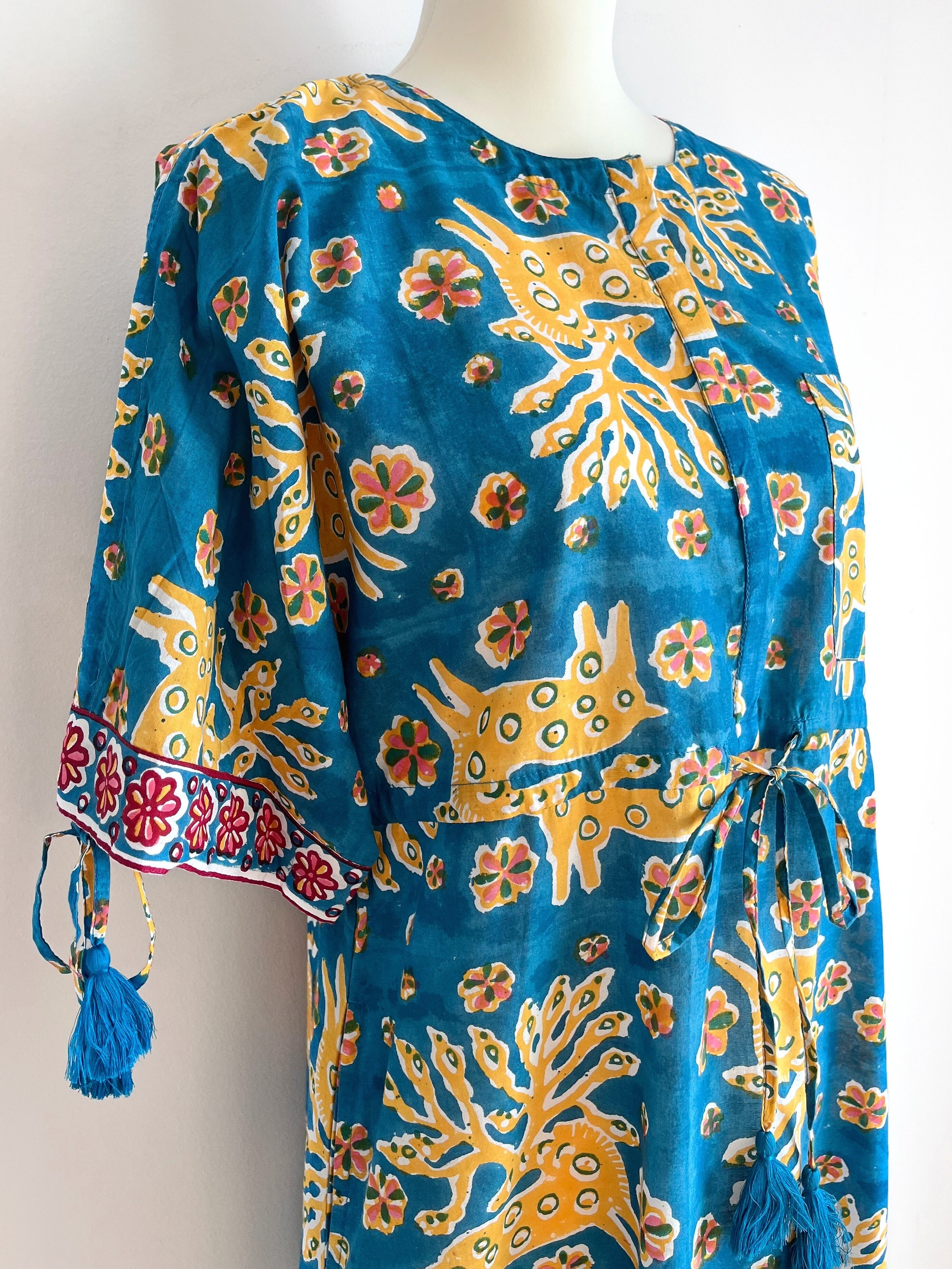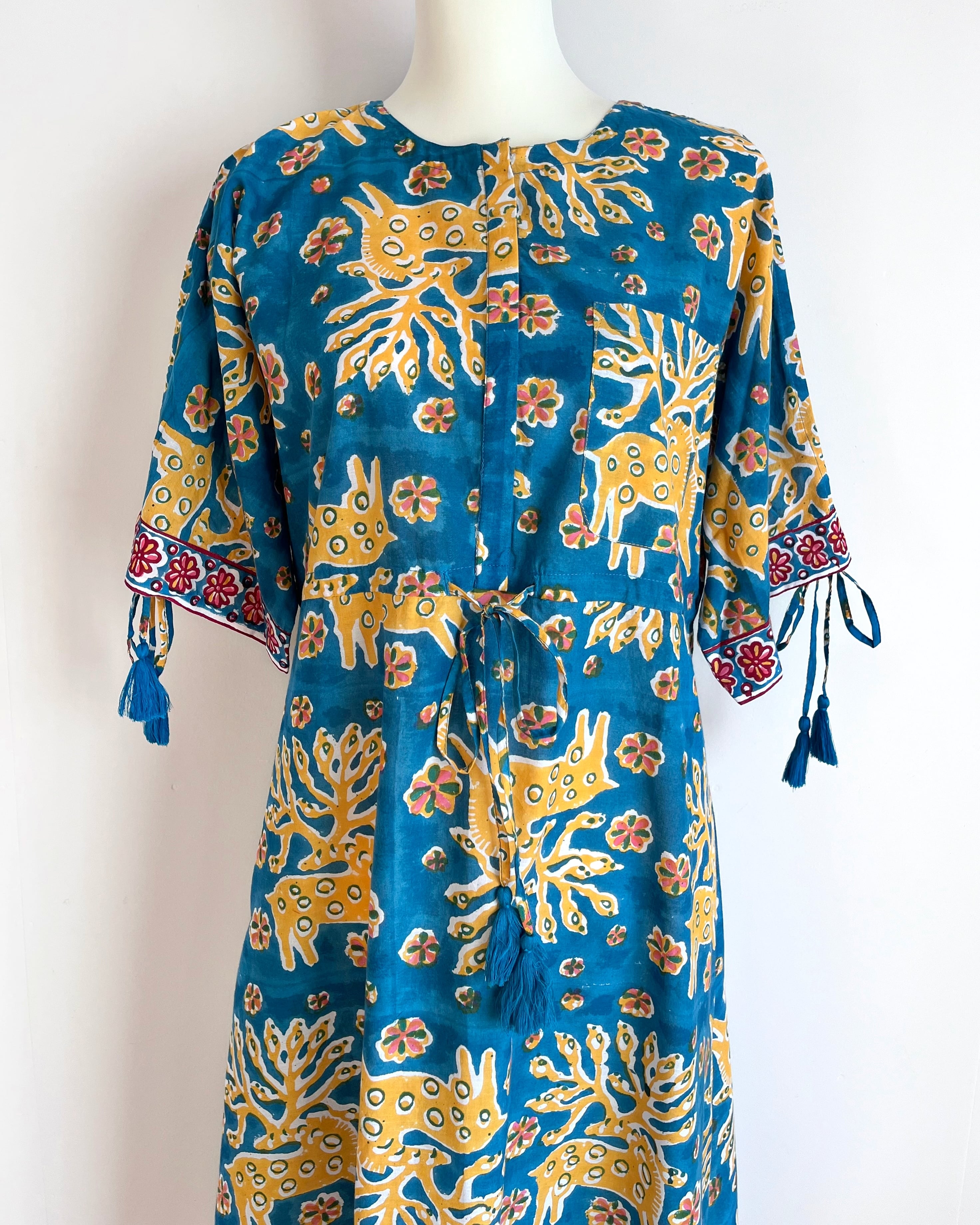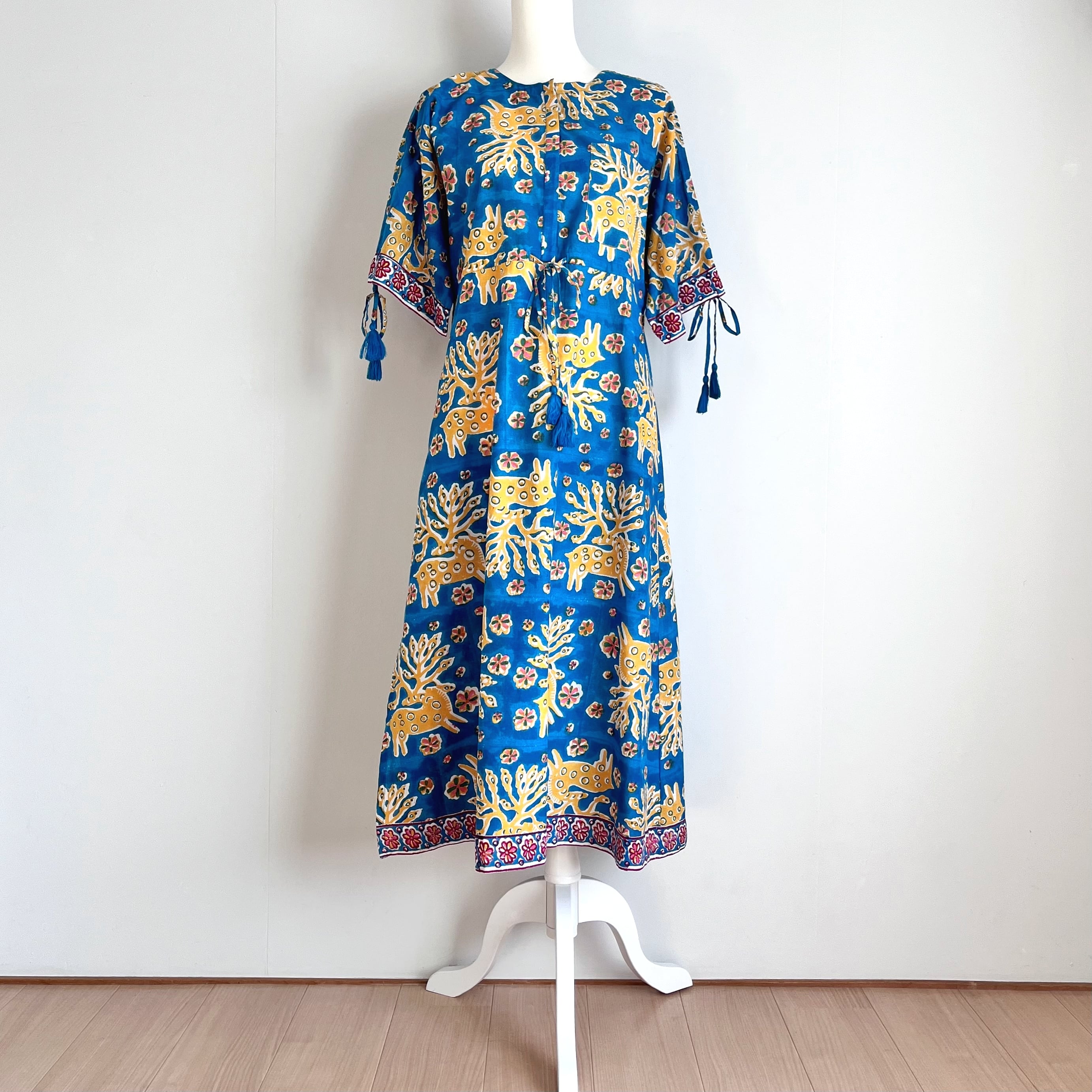 Sanganeri ハンドブロックプリント ドルマンスリーブ カフタン ワンピース Forest Spirit M〜XL
