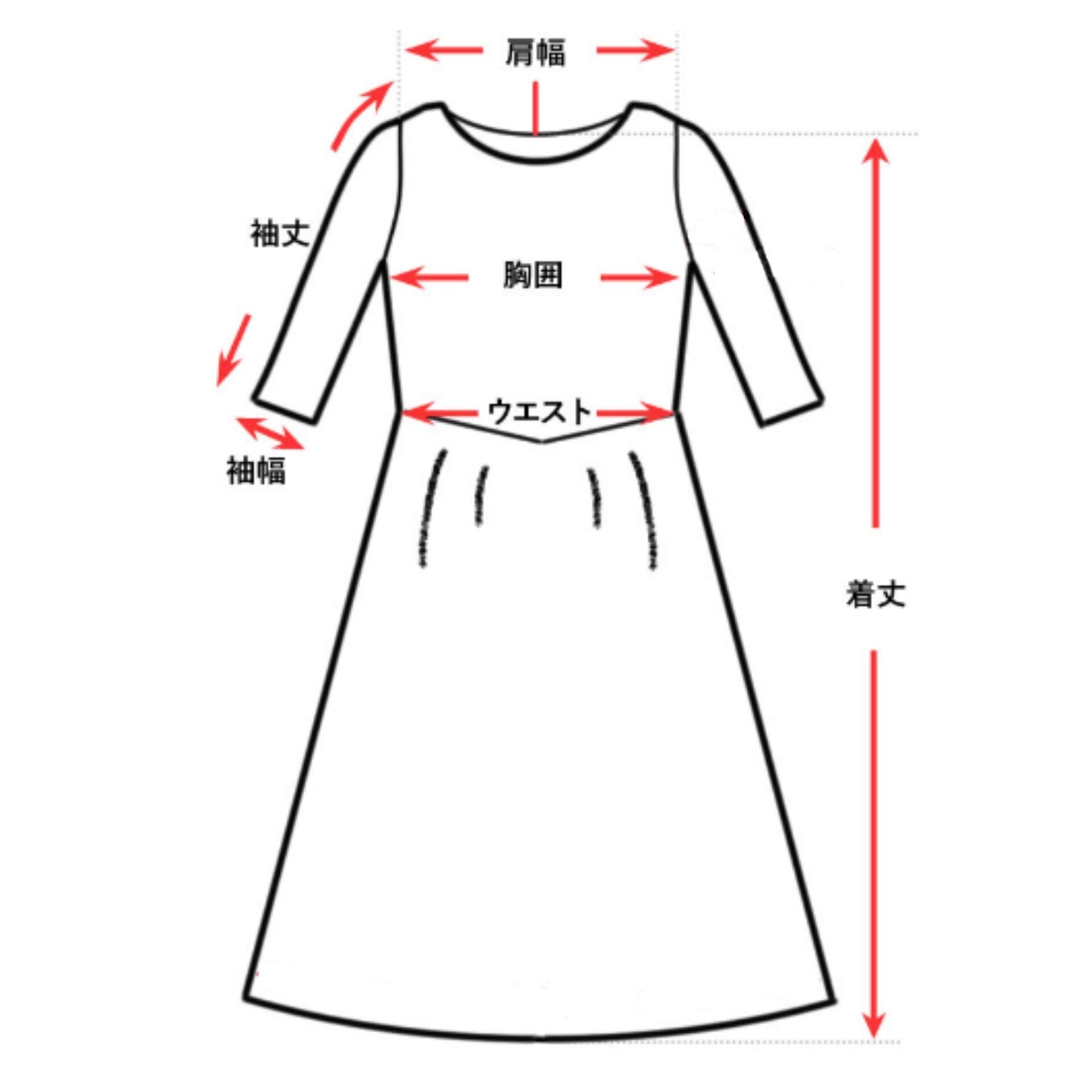 バスト 約 106 cm、ウエスト 約 96 cm、ヒップ 約 114 cm、肩幅 約 42 cm、袖ぐり 約 60 cm、袖丈 約 30 cm、袖口 約 44 cm、身丈 約 108 cm、右裾スリット 約 33 cm