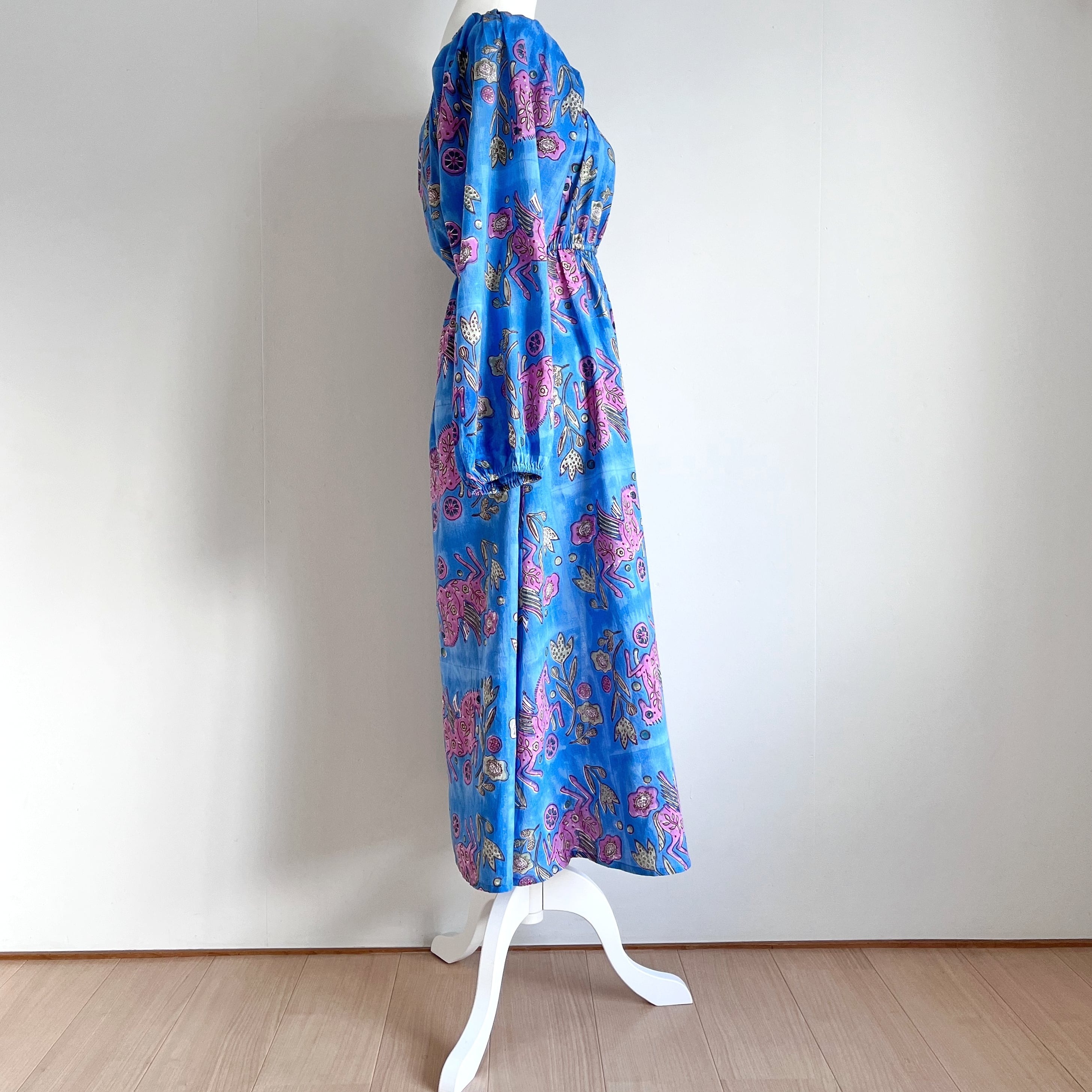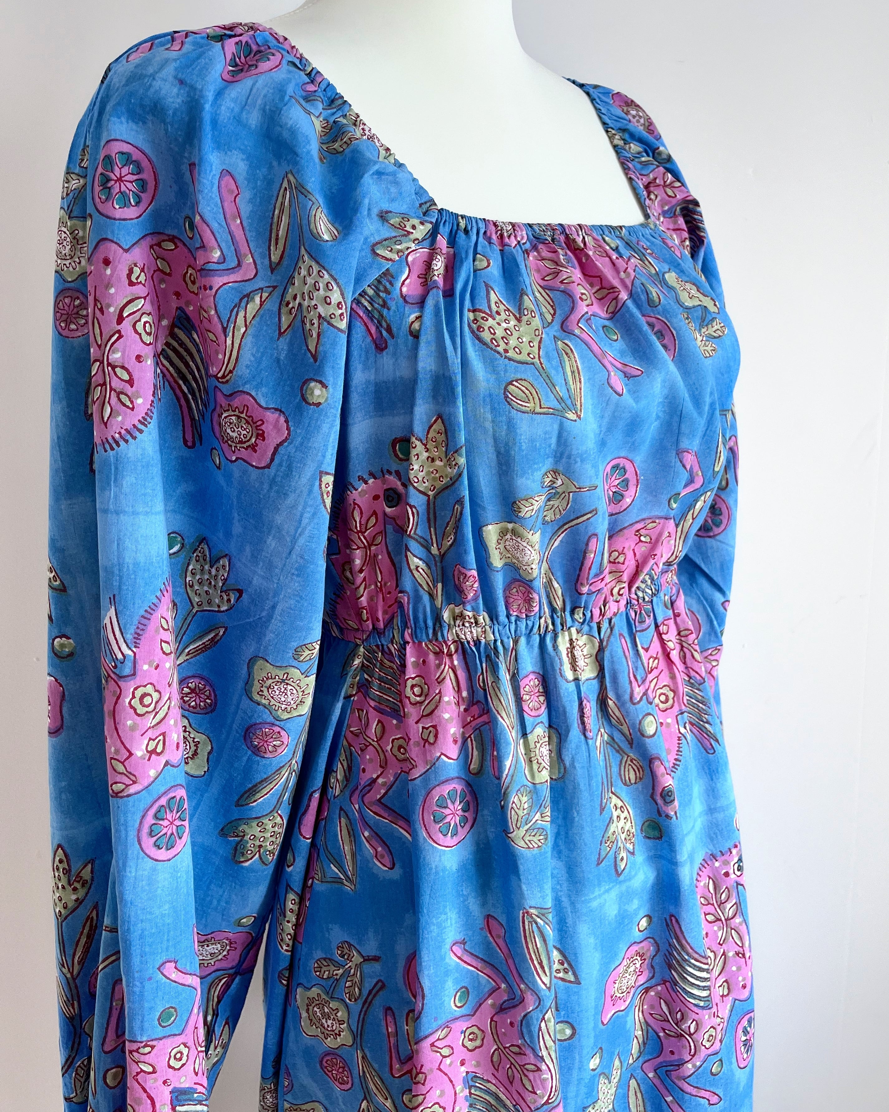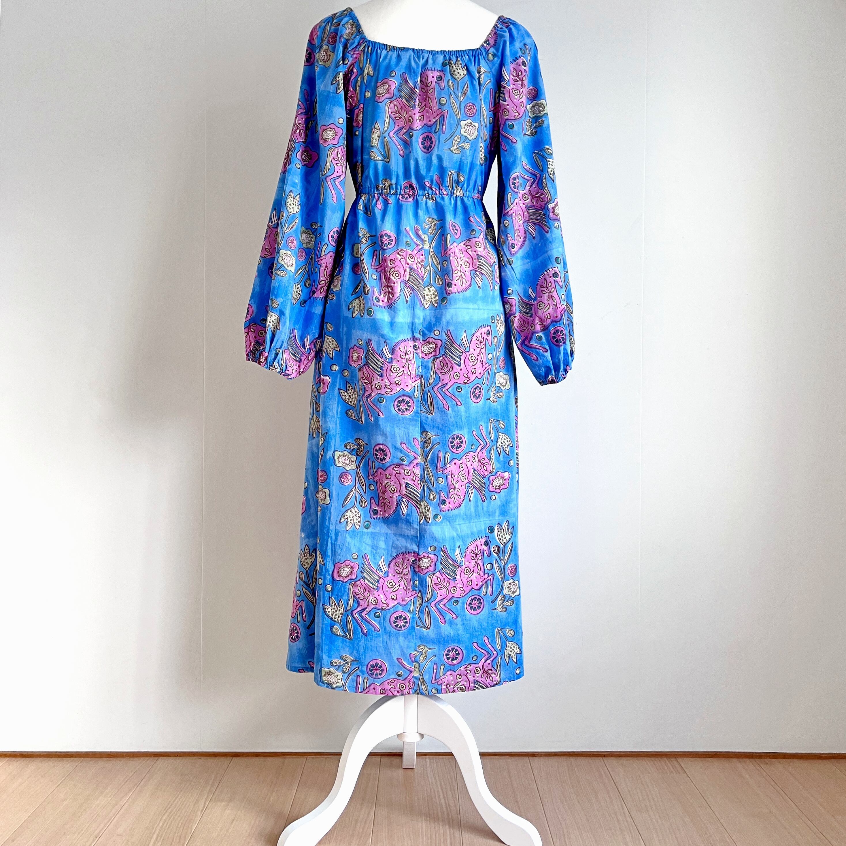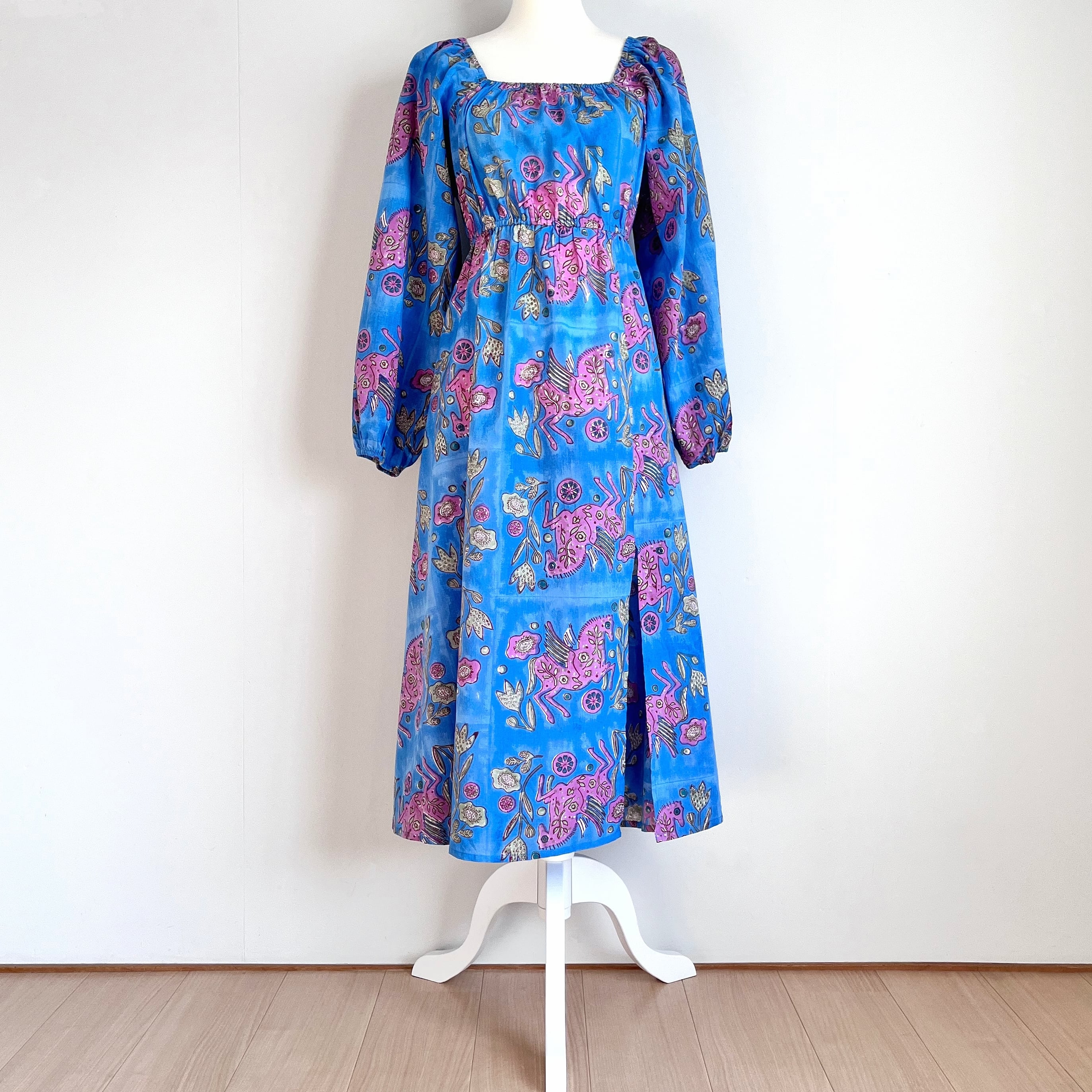 Sanganeri ハンドブロックプリント スクエアネック パフスリーブ スリット ワンピース Pegasus XS〜M