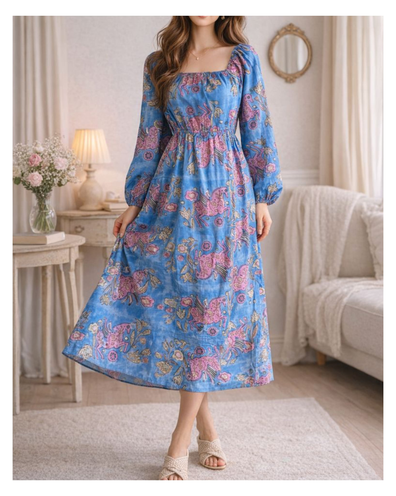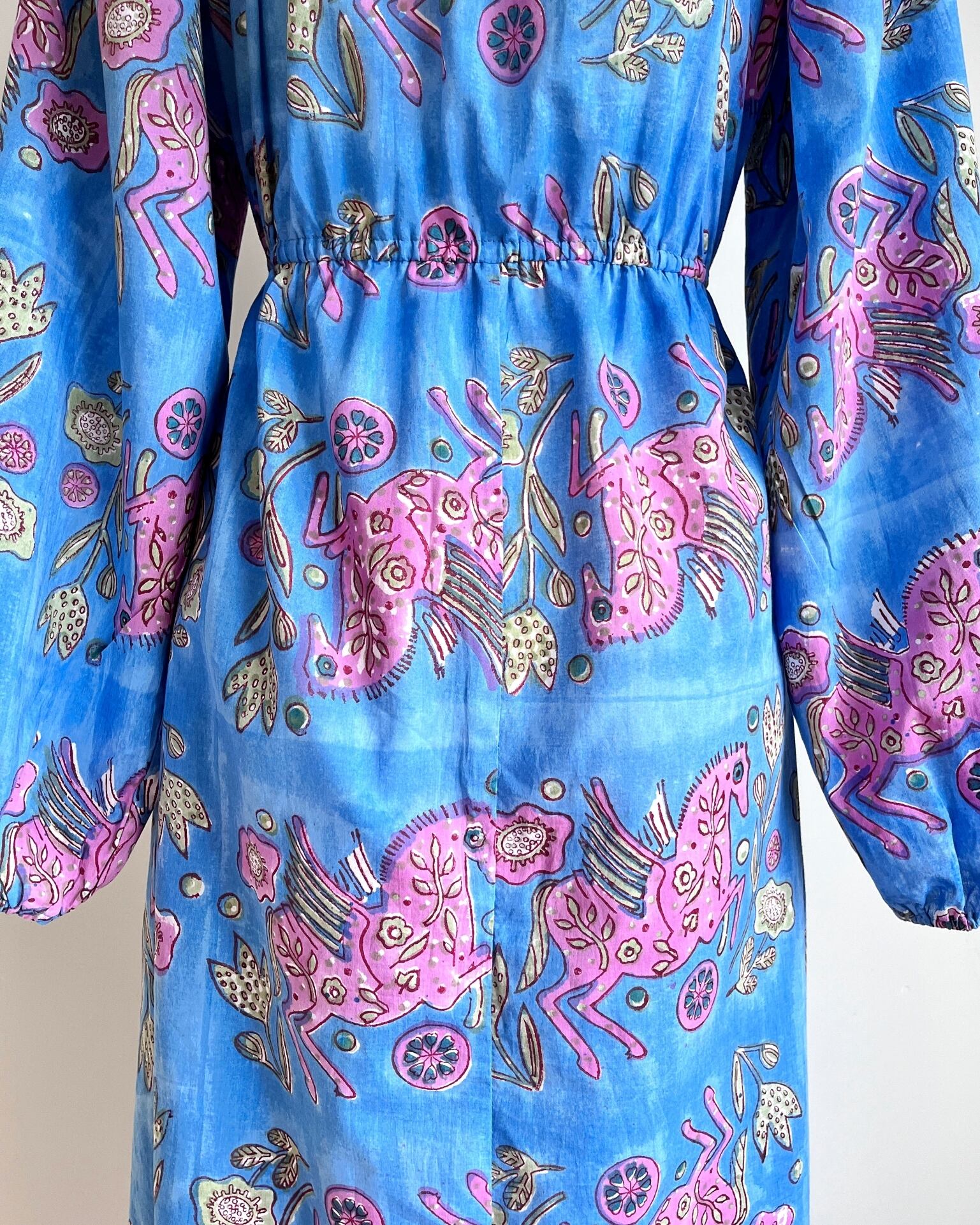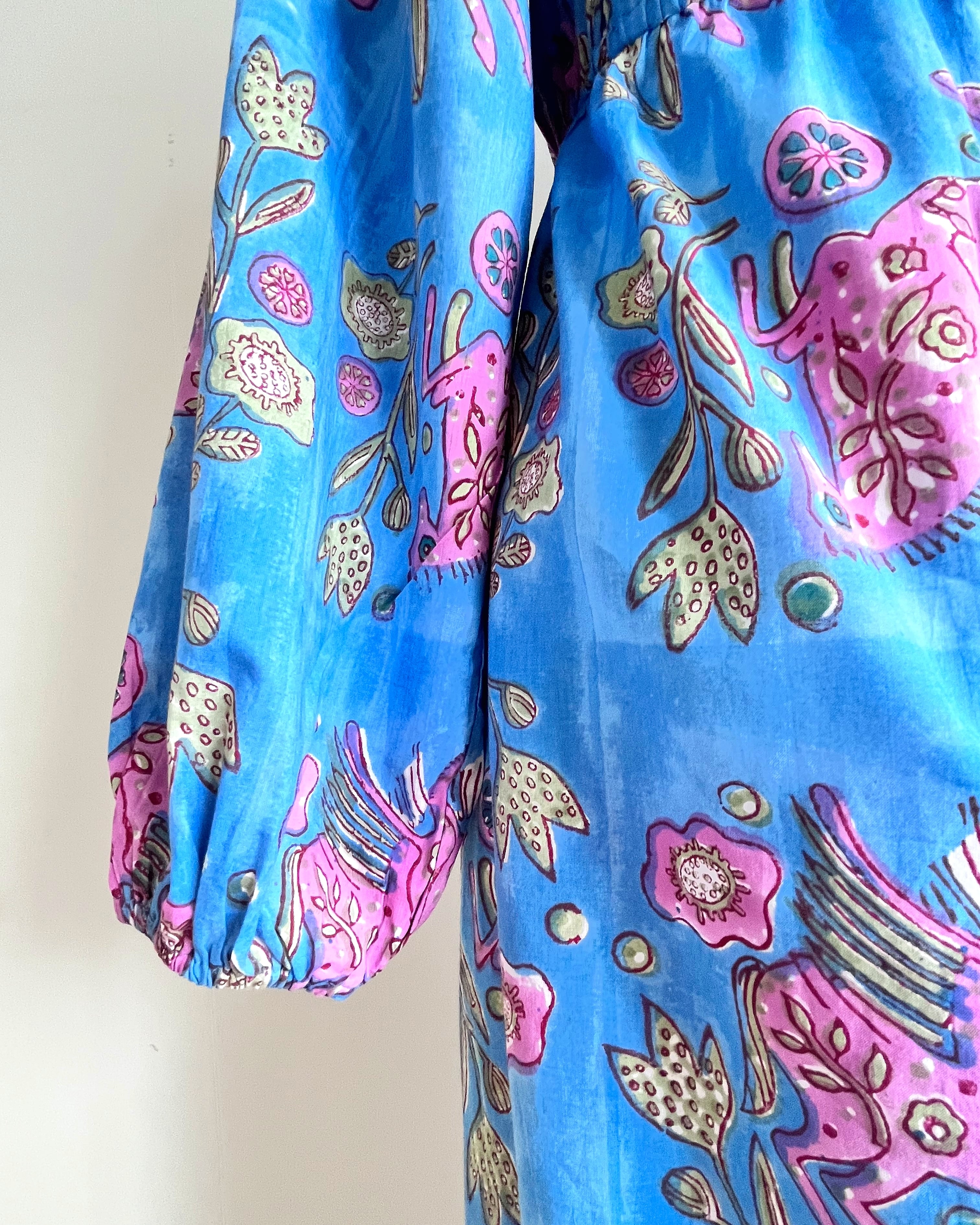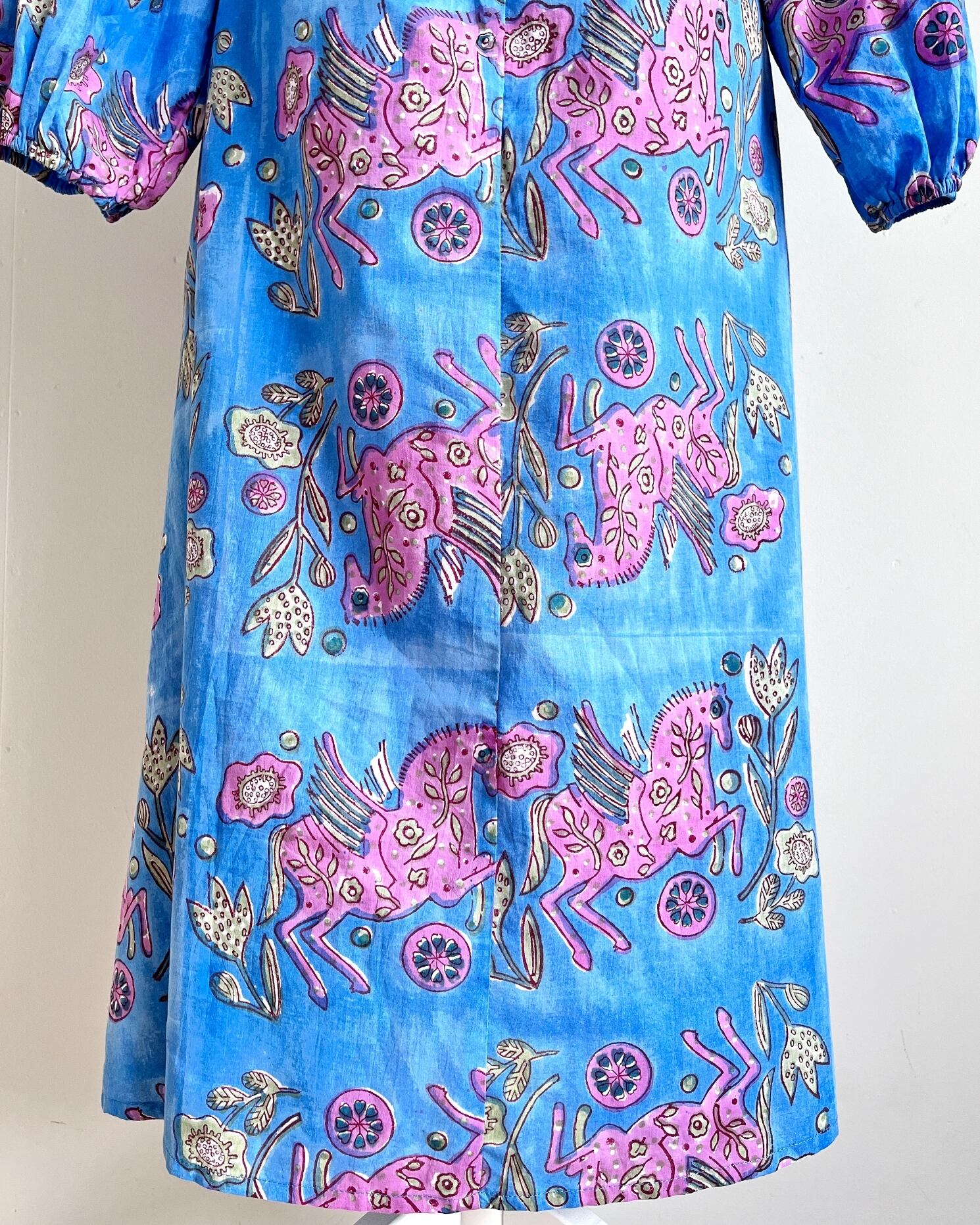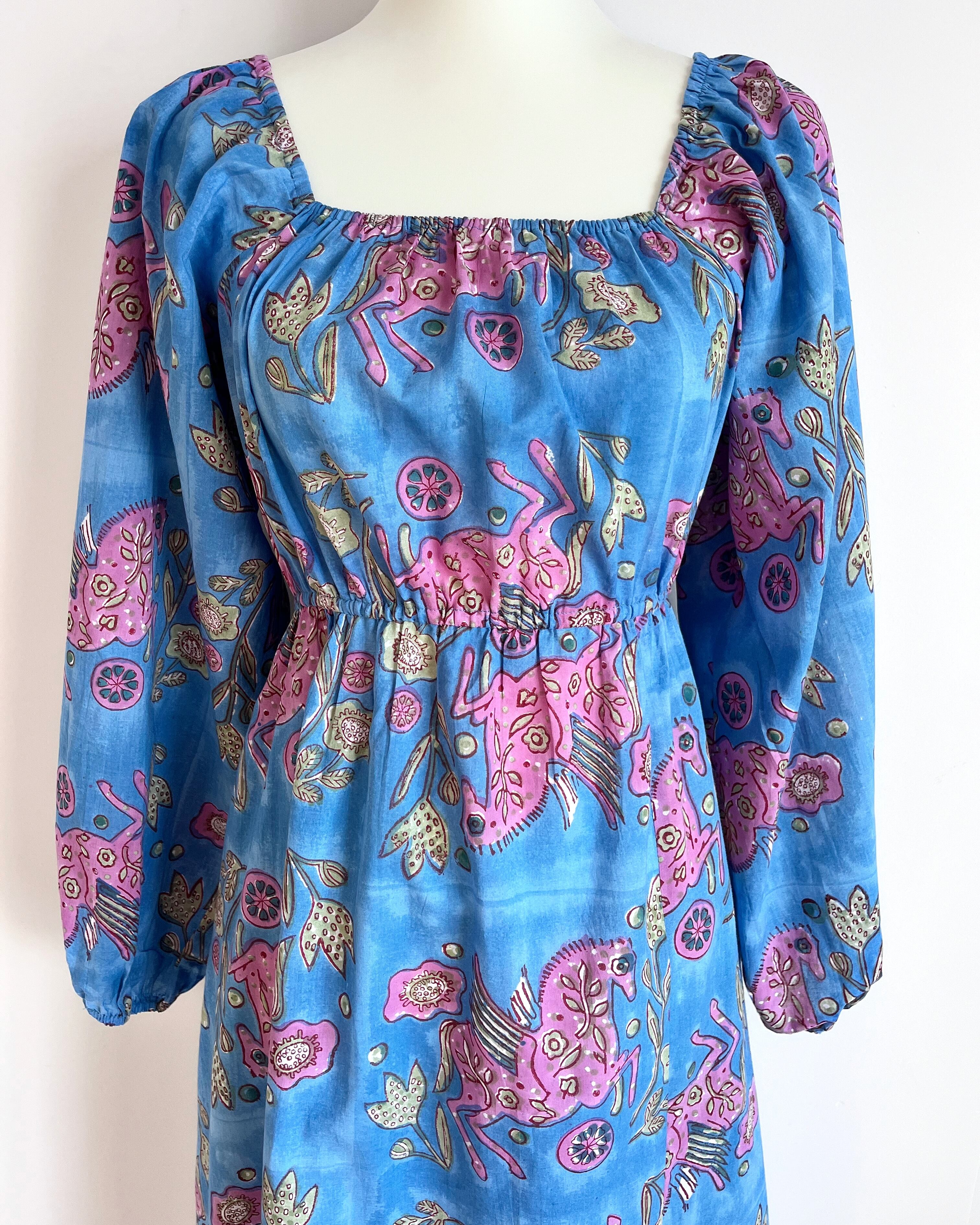 Sanganeri ハンドブロックプリント スクエアネック パフスリーブ スリット ワンピース Pegasus XS〜M