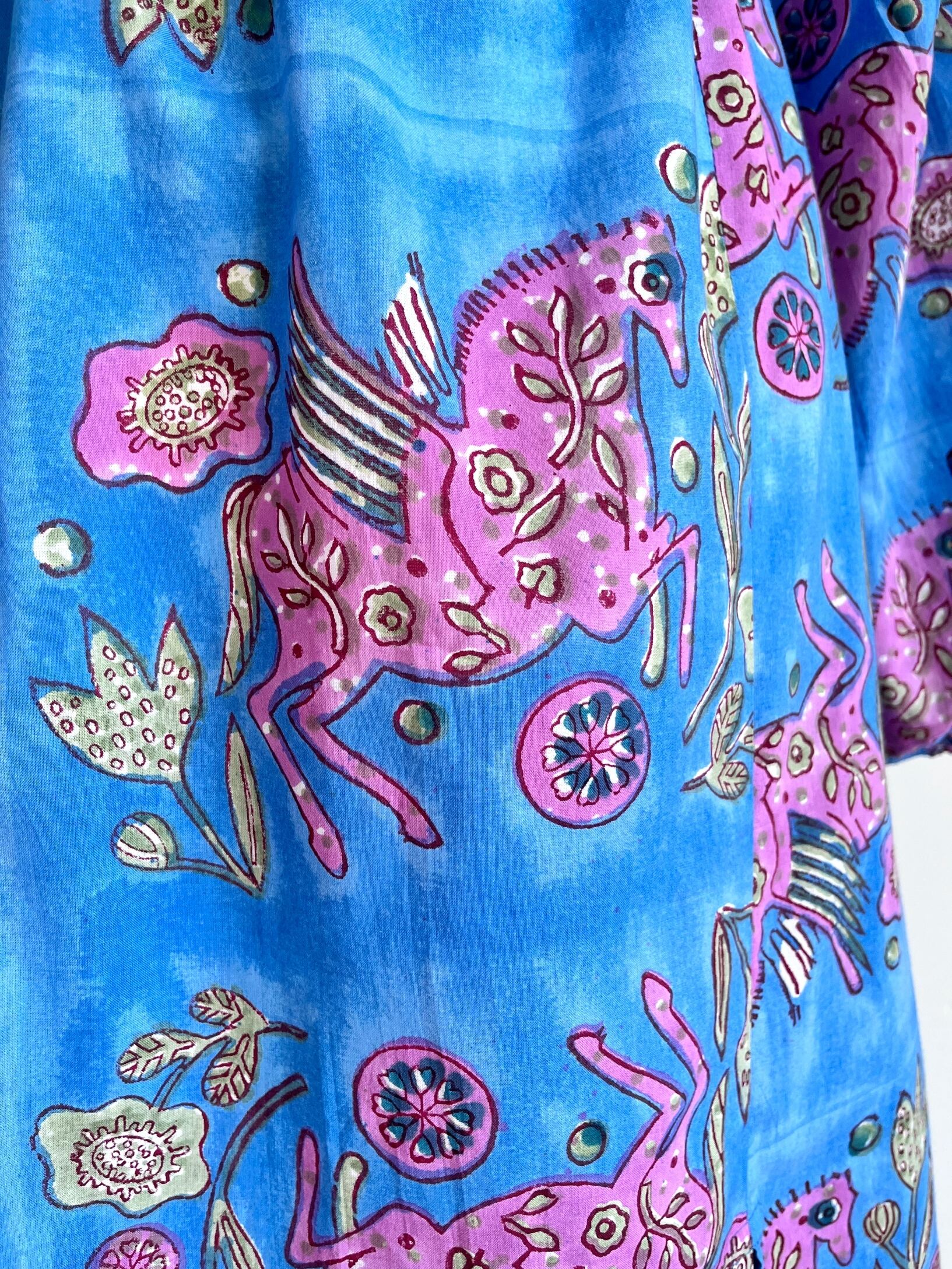 ブルーにペガサスの手押し木版が幻想的でノスタルジックなテキスタイル。