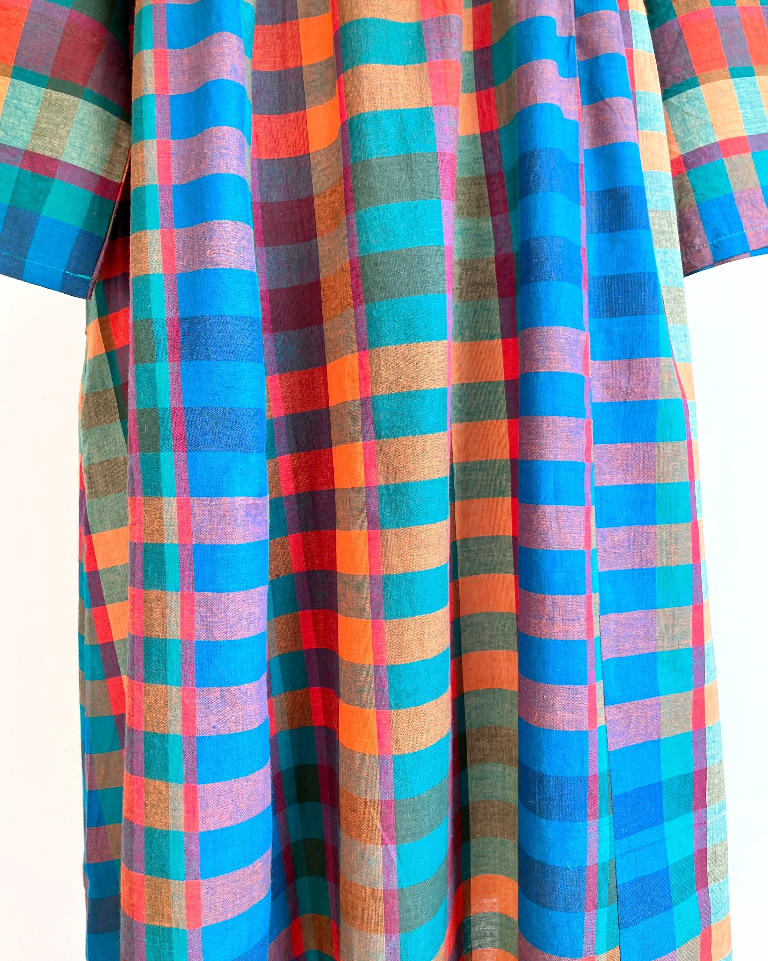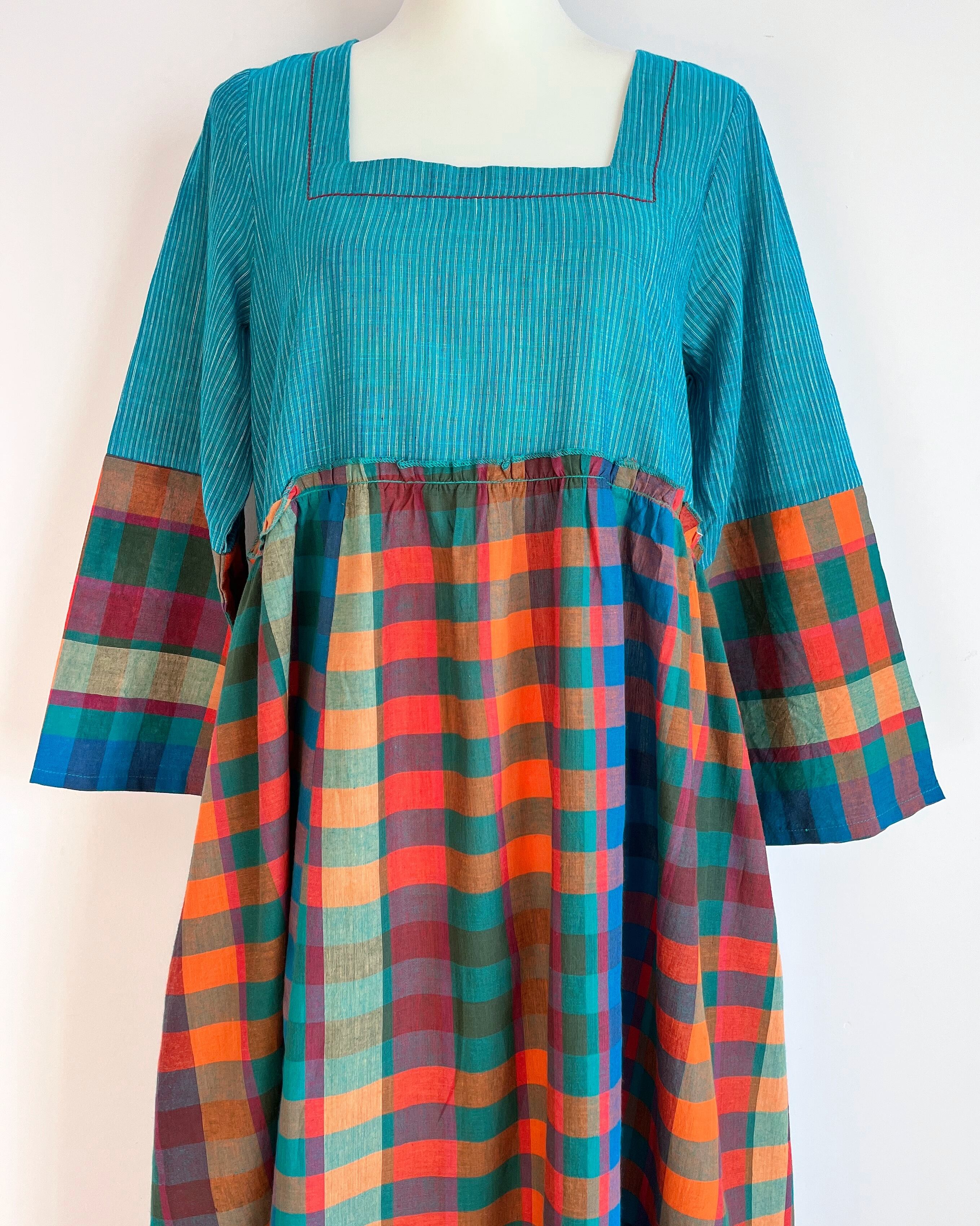 Madras Check & South Cotton ハンドルーム スクエアネック マキシ ワンピース M〜XL