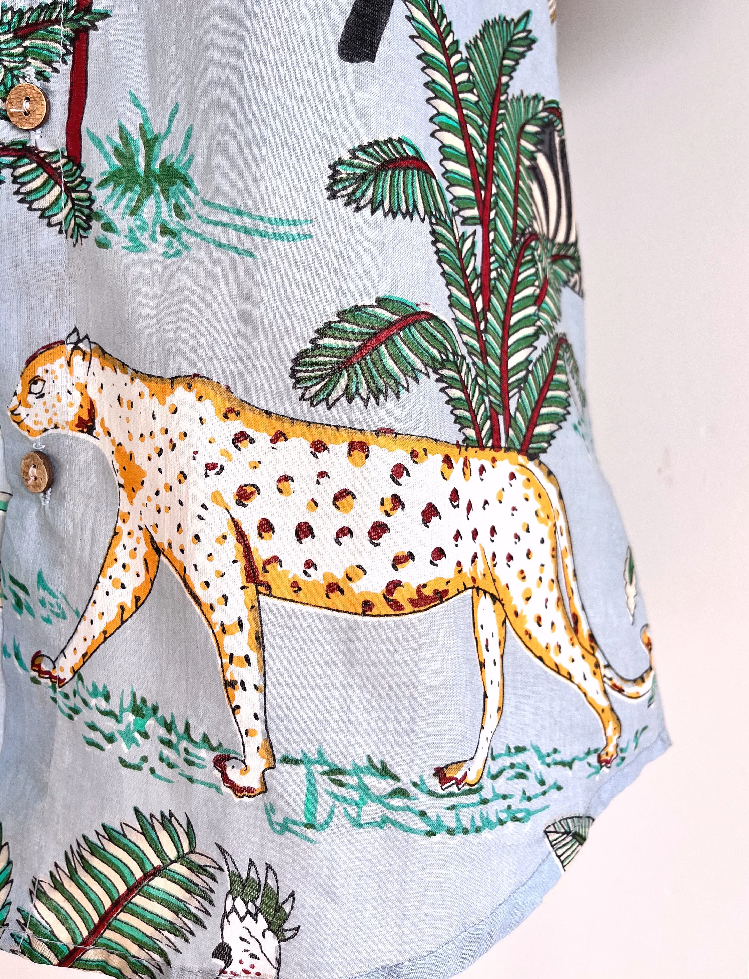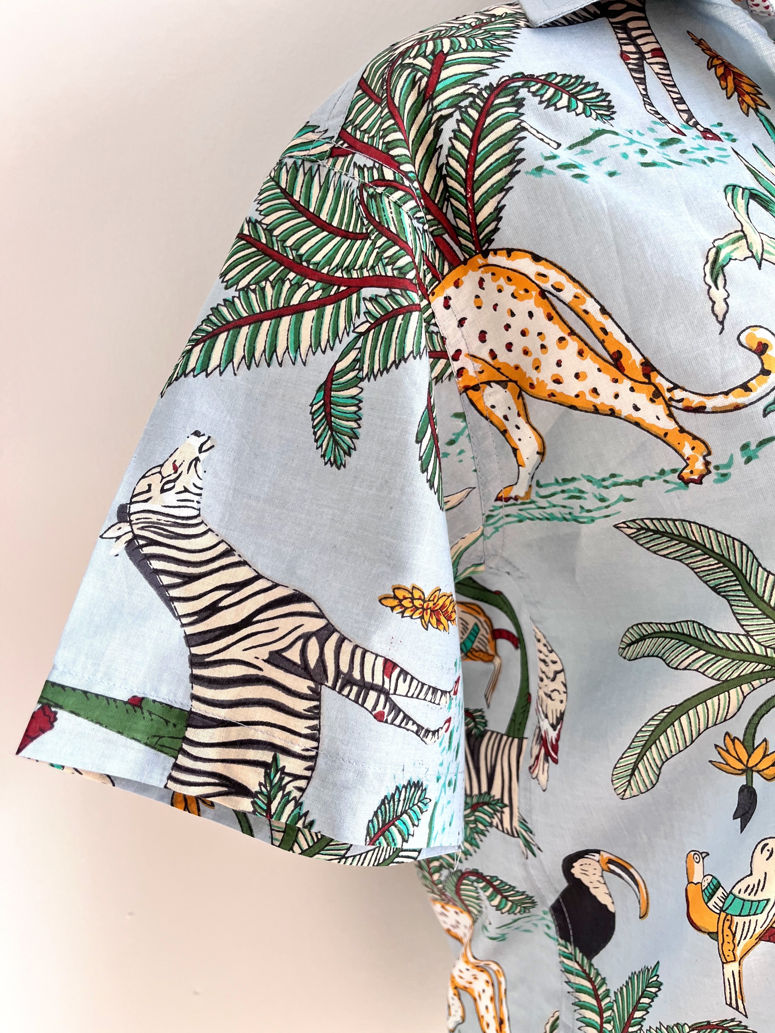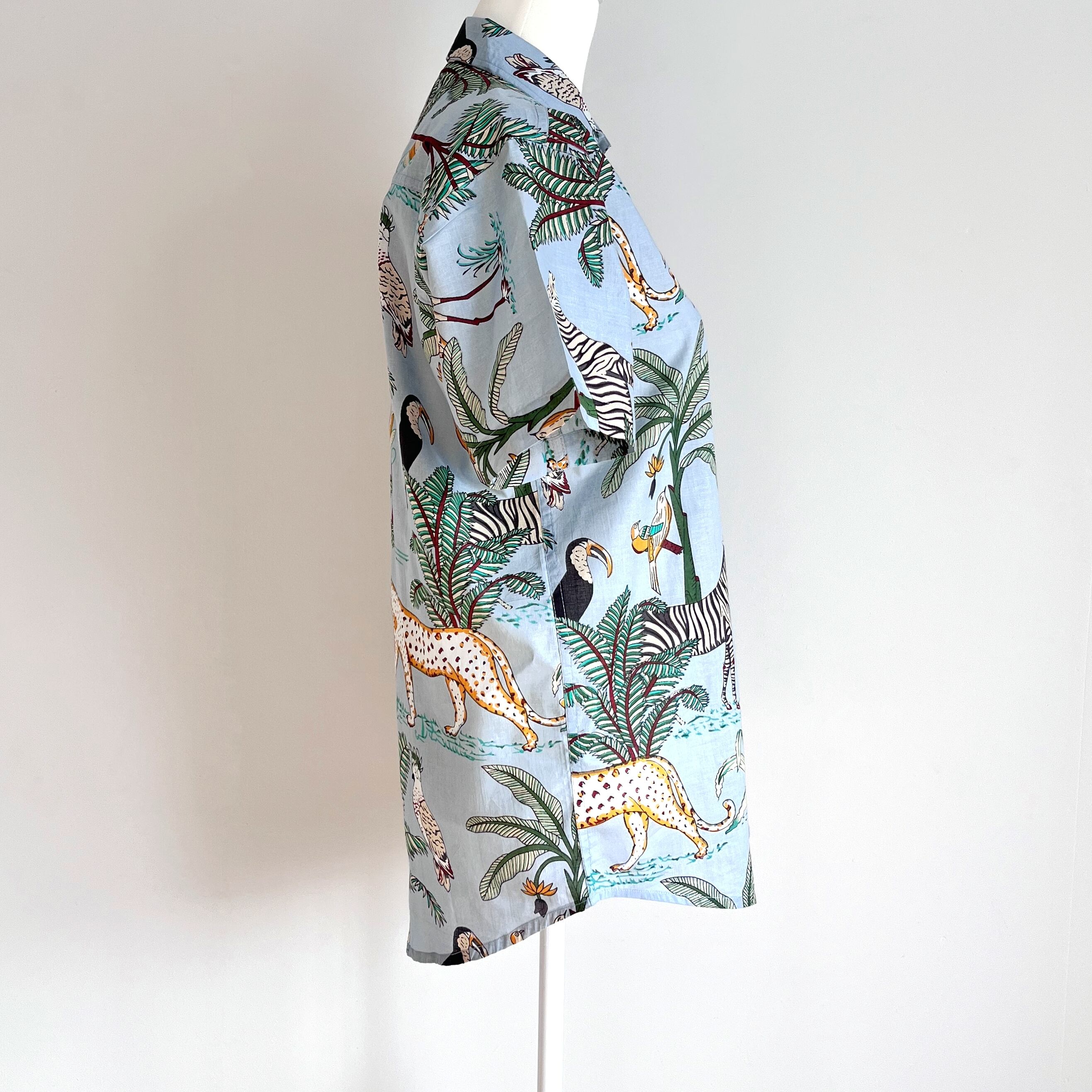 南国ジャングルの動植物が賑やかなスタンドカラーシャツ。
