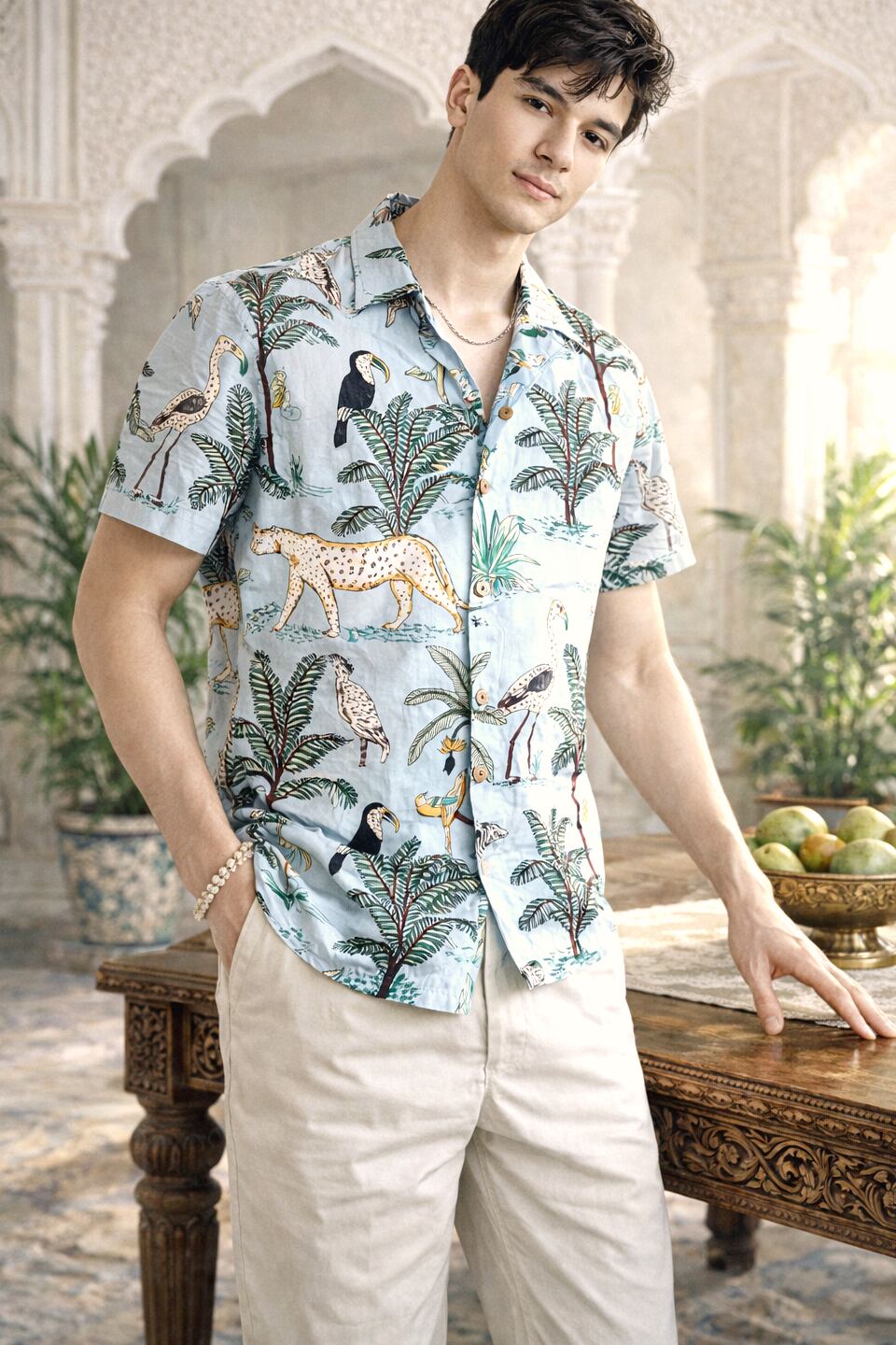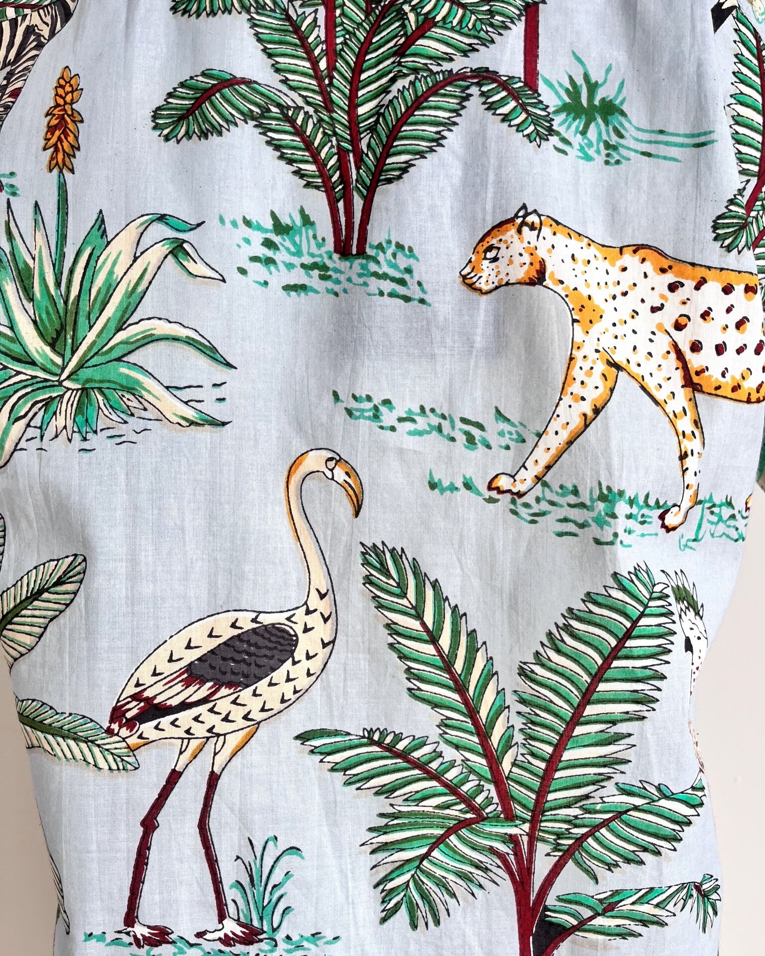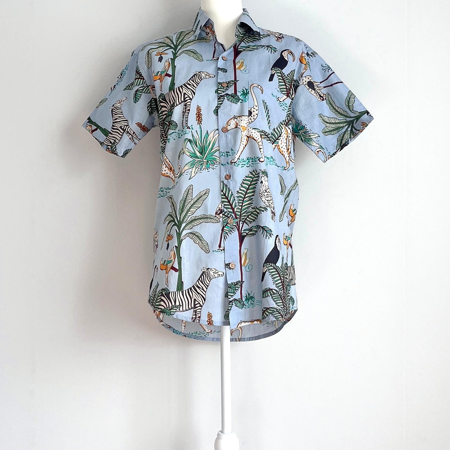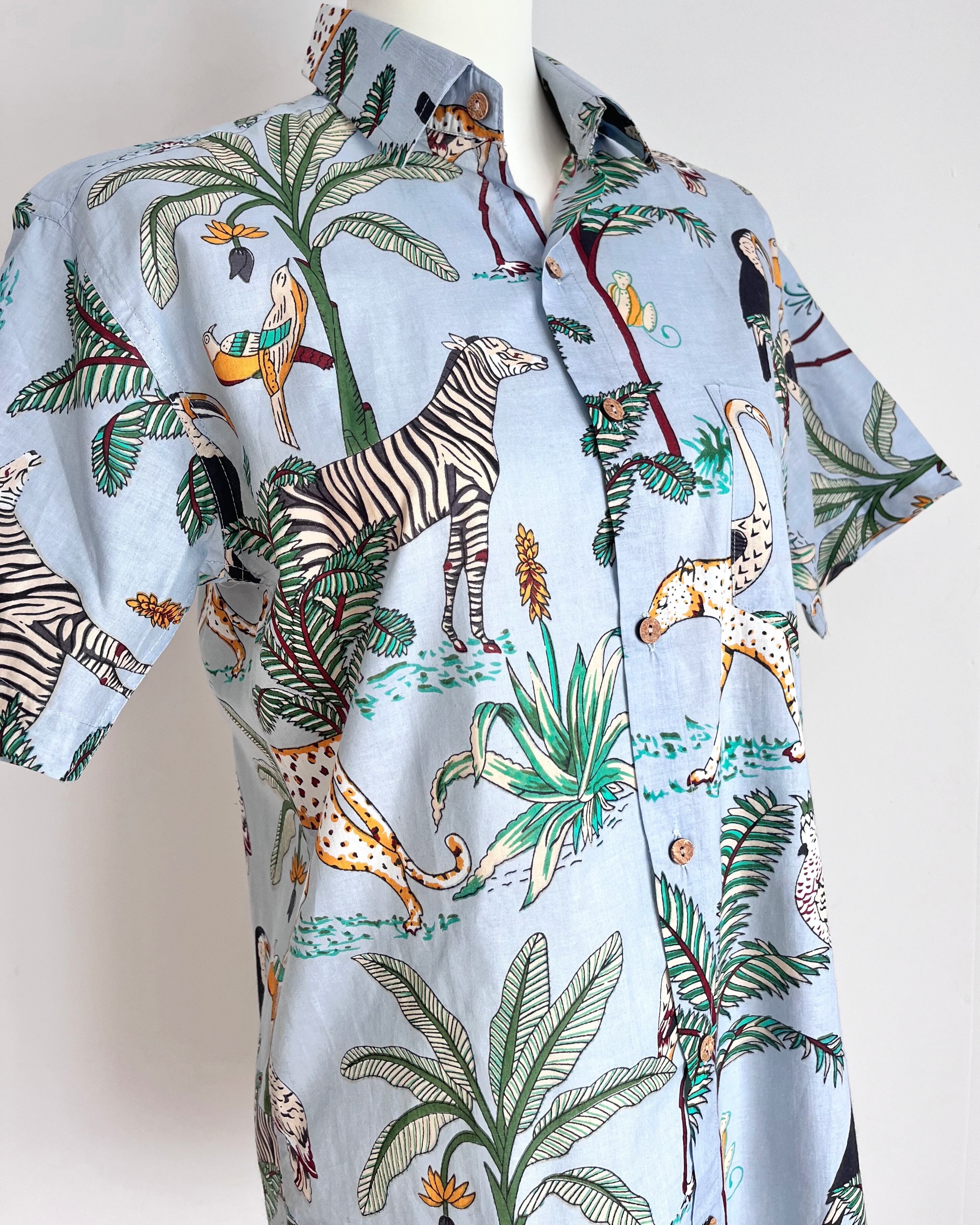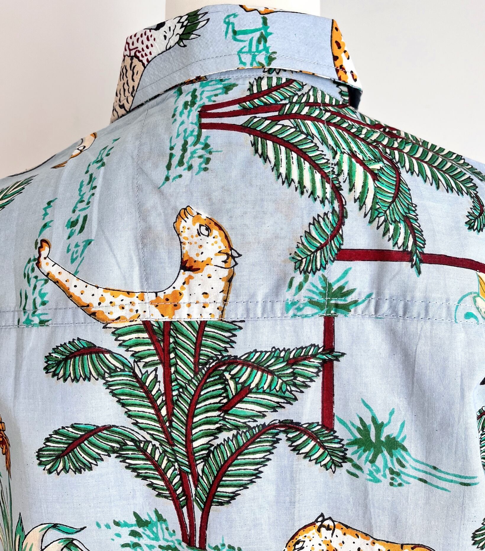 南国ジャングルの動植物が賑やかなスタンドカラーシャツ。
